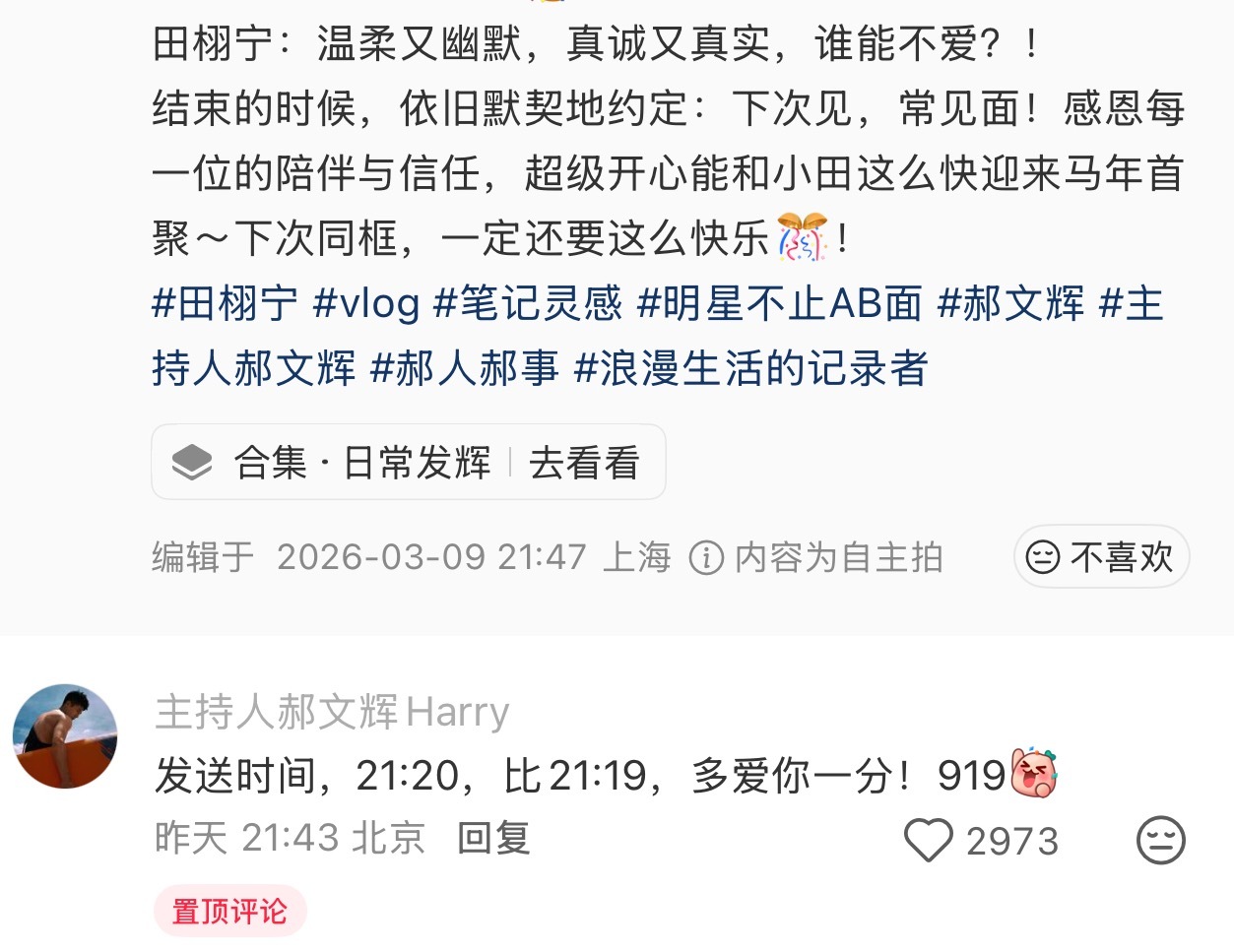 田栩宁 温柔又幽默,真诚又真实,谁能不爱?!“发送时间,21:20,比21:19,多爱你一分!919”