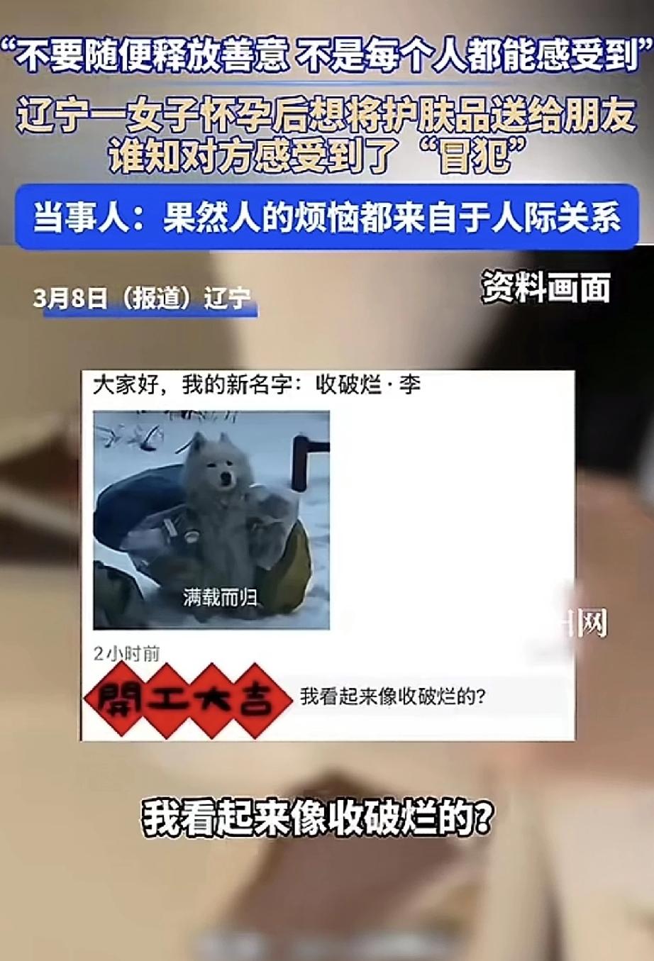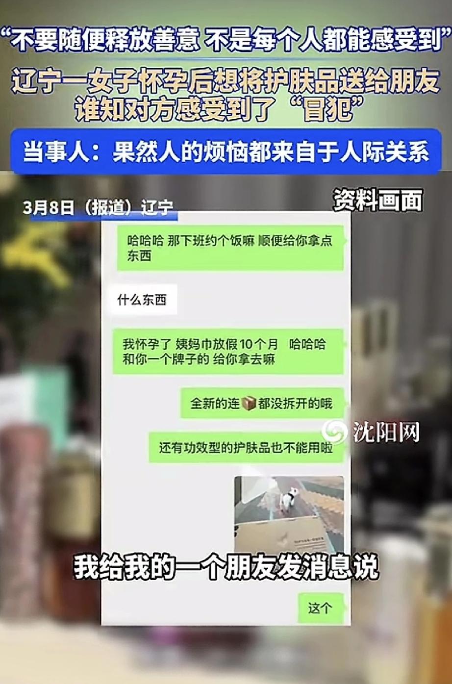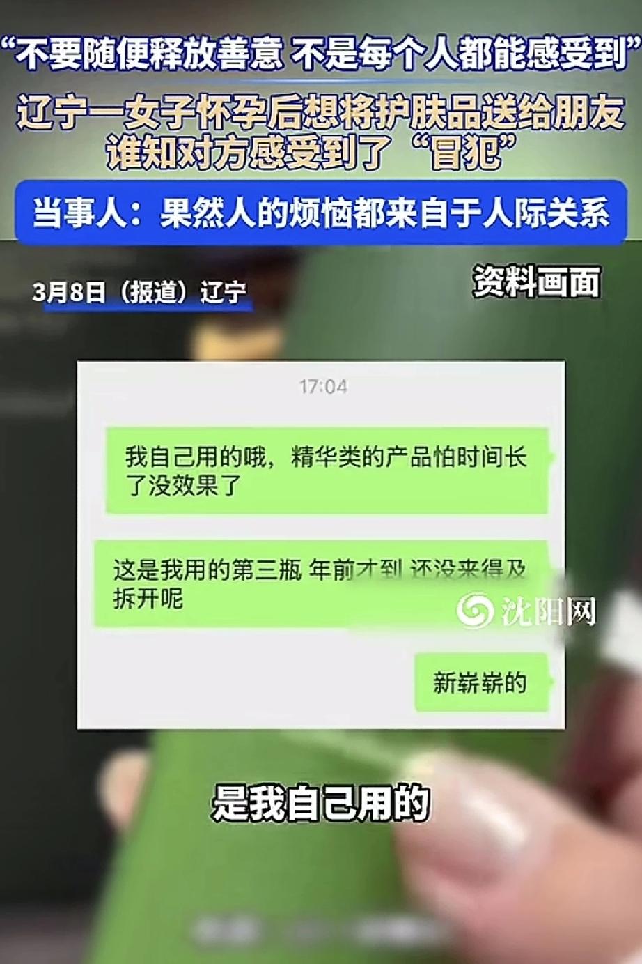 辽宁,一女子发视频分享,最近自己怀孕了,想着自己怀孕期间不能使用一些功能型的护肤品了,便想着将自己全新还未使用过的护肤品送给她的好朋友,于是女子便发消息给好朋友,让其这些护肤品拿去用。不料,消息发过去后,好朋友不仅没回复,还在朋友圈发心情表示“自己看起来像收破烂的”。 这时女子才反应过来,原来自己好心好意,反而让朋友感受到了被“冒犯”了!为此女子感慨道,看来不能随便释放善意,因为不是每个人都能感受到,而人的烦恼都来自于人际关系… 此事被女子分享到网上后,也是引起了网友们的一片热议。 有网友就表示:我怀孕的时候,我闺蜜给我她孕期穿过的衣服,我觉得很好啊,又干净又省钱,她家小孩儿的有些好的旧衣服也是她送我的。大家条件都不差的,我觉得这样很好,资源得到了充分再利用,看来每个人的想法都不一样吧。 还有网友表示:个人觉得与女子无关,只能说,你的朋友内心太敏感了,防备心强,一般人都会觉得很暖心很感激吧。如果觉得跟这种人相处很累,那就早点结束得了。 也有网友表示:这好朋友做得没毛病啊,现在谁喜欢要别人的东西呀,所以释放善意之前,应该先征求别人意见才礼貌嘛,这强塞给别人是不太妥当了。 个人觉得一个网友说得很在理,其实也挺好,从这件事不就看出来这不是真心朋友了嘛,以后保持距离就好了。因为真正的朋友,估计会拿编织袋冲进你家,装不满不走吧。其实人际关系并不复杂,对你真心的人不会嫌弃你,对你不真心的远离就行了。