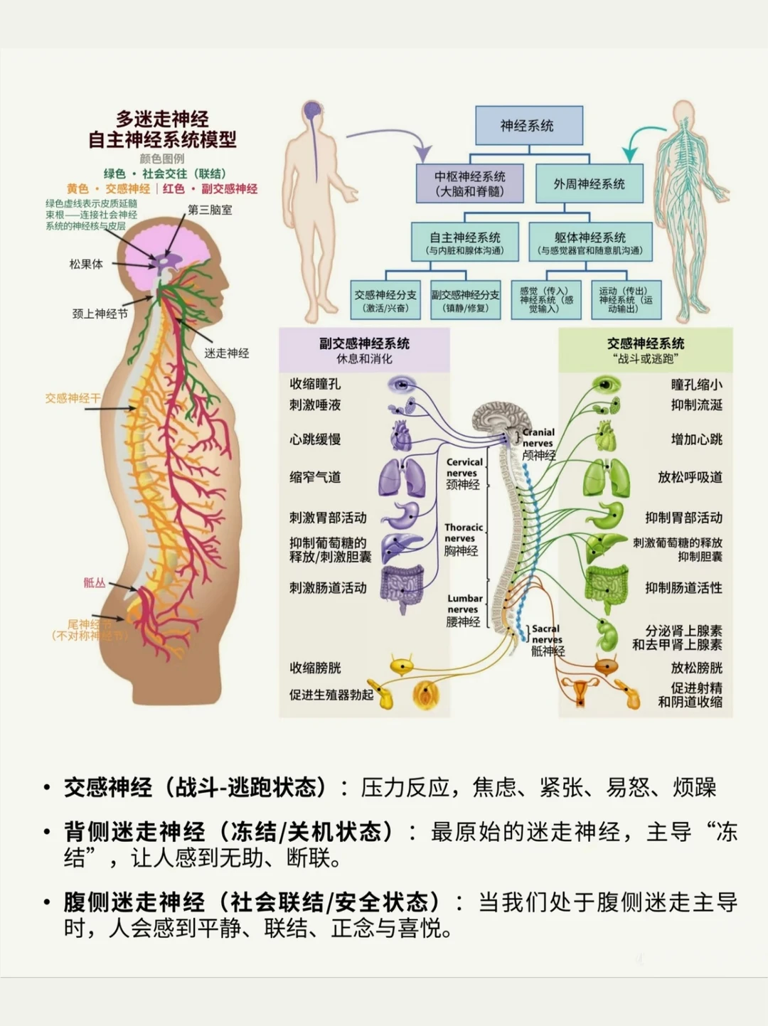 一个颠覆认知的是,不是进入副交感就是完全的好,同时迷走神经是否真正的被激活,所以有些心理咨询、创伤疗愈没有用,是因为人们还处在恐惧里面,身体还没有感觉到安全,却在强行的放松,强行的冥想和正面里面,这样只会让人更累,交感神经让你活下来,而迷走神经让你真正的活着。