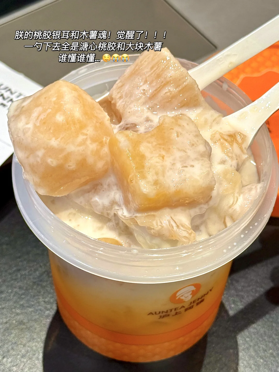 婶子溏心桃胶木薯炖奶你!!!怎么能!!!这么顺滑这么软糯啊你!!!!!!黄心木薯+荔浦芋泥+桃胶银耳!俺心目中顶好吃的三种小料搭配….感觉料比之前多多了!!! 滑溜溜的桃胶银耳,q弹软糯还贼拉丝!!超多黄心木薯哽啾又糯叽!溏心木薯吼吼次啊😭加上绵密芋泥,一勺下去粘稠的胶质感爆棚[色色R][色色R]再另外加份芝士奶盖,又添了分咸香醇厚简直神作啊!!! 好适合打工人下午茶或者学生党晚间补充一下子!满满的膳食纤维,健康还很饱腹都阔以当代餐了😚