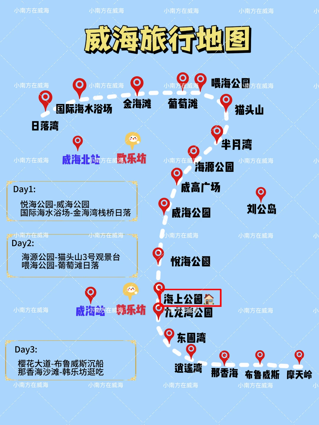 想出行来回都方便,建议住在威海站-海上公园附近,在所有景点的中间,附近有韩乐坊吃饭选择也多。选酒店时一定要选离海边近的!4月是淡季,很多海景房200就能拿下!