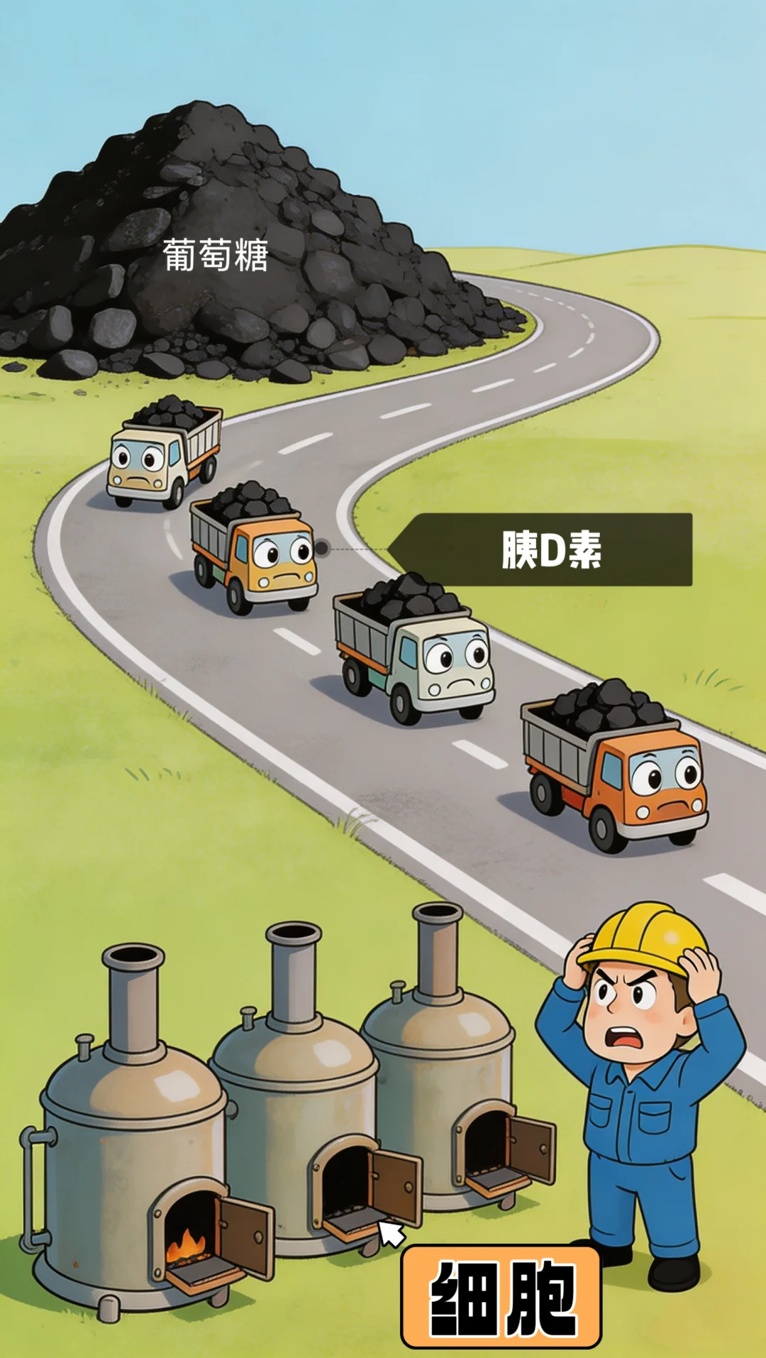 如果葡萄糖是煤,给细胞这些锅炉提供能源。那胰D素就相当于是把煤运到锅炉的卡车。一开始煤大量出现的时候,小卡车还能努力运输。但时间长了卡车坏了好多,运不过来。于是煤开始堆在路上,堵塞交通、污染道路。锅炉又得不到煤,纷纷熄火。为了疏通道路,又有一些小车被派出来把堆积的煤运到仓库里。最后就是锅炉得不到煤,仓库里和道路上的煤却堆积如山。