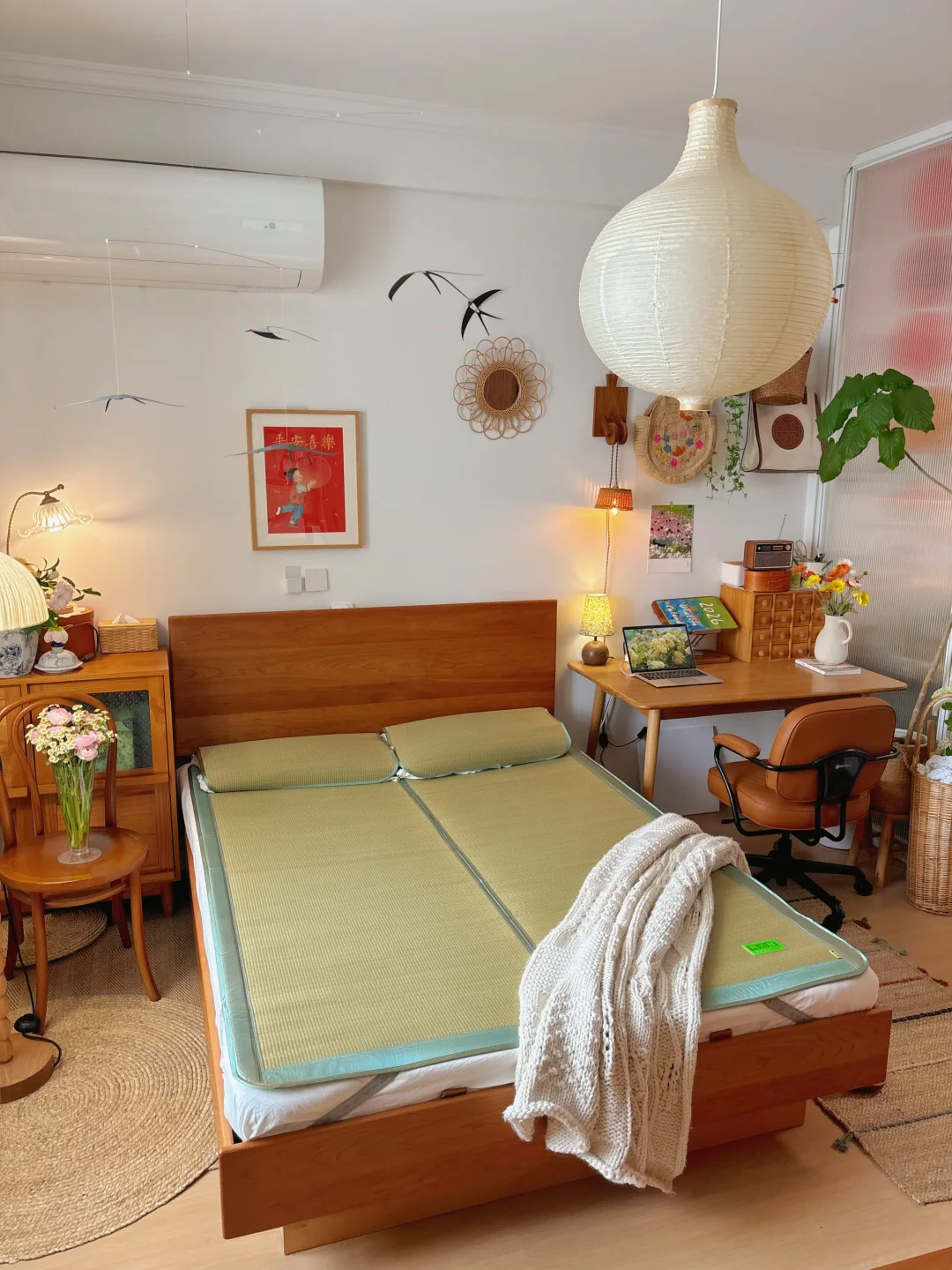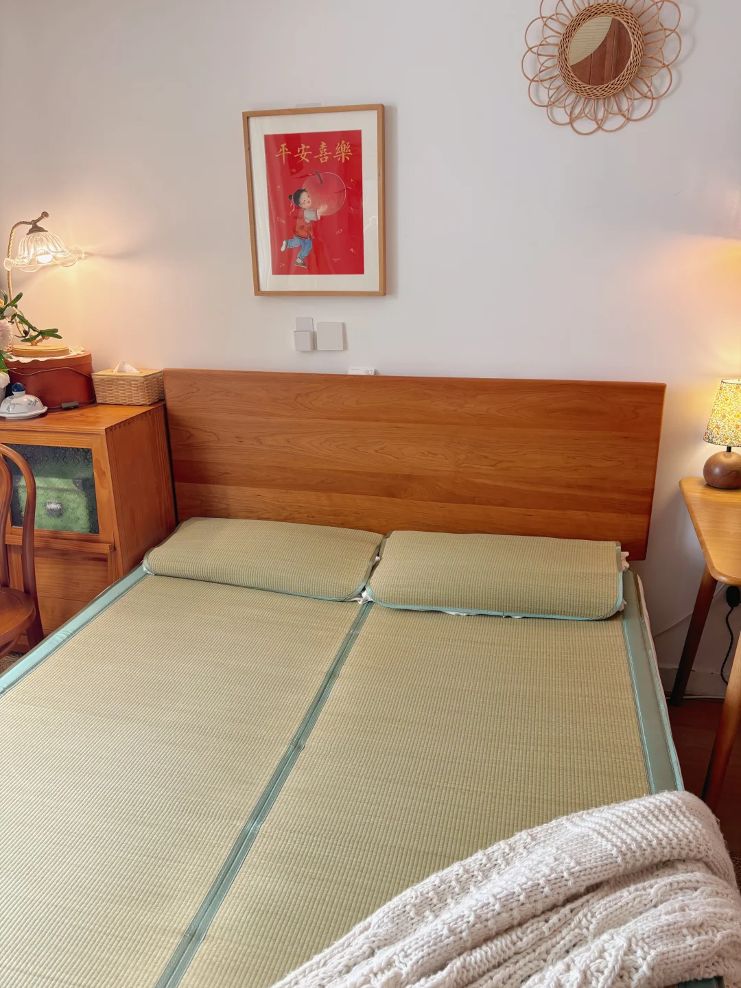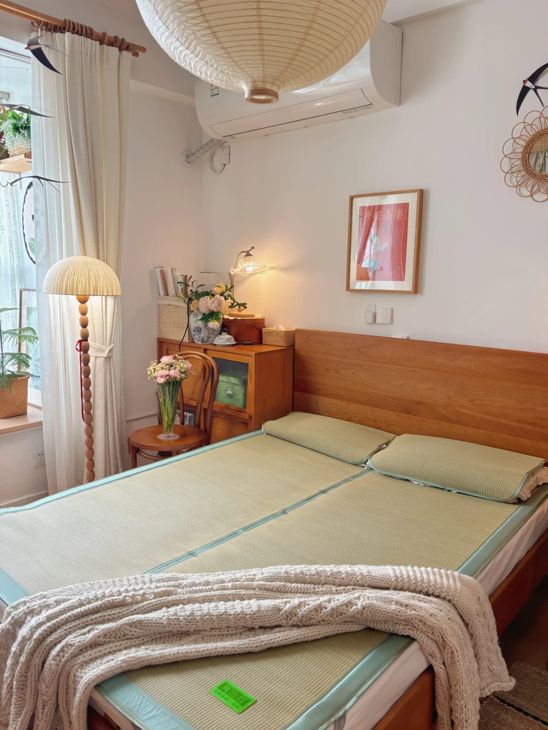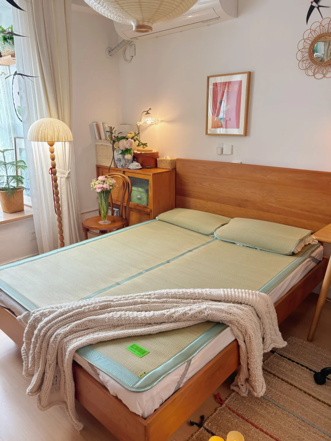 复古原木风卧室的凉席已就位