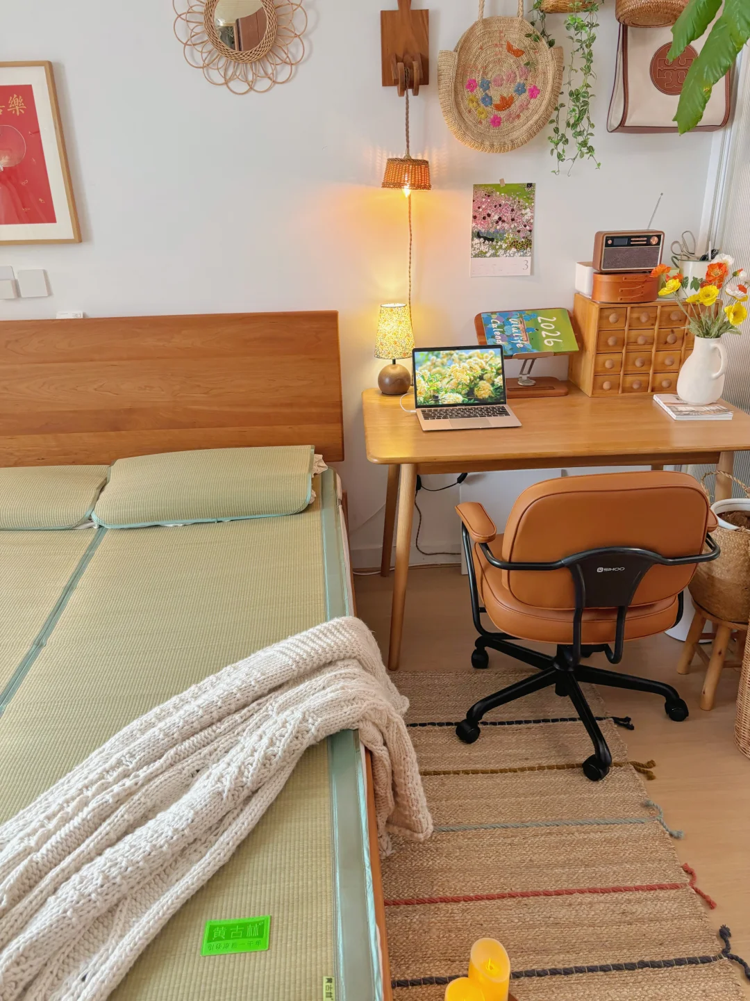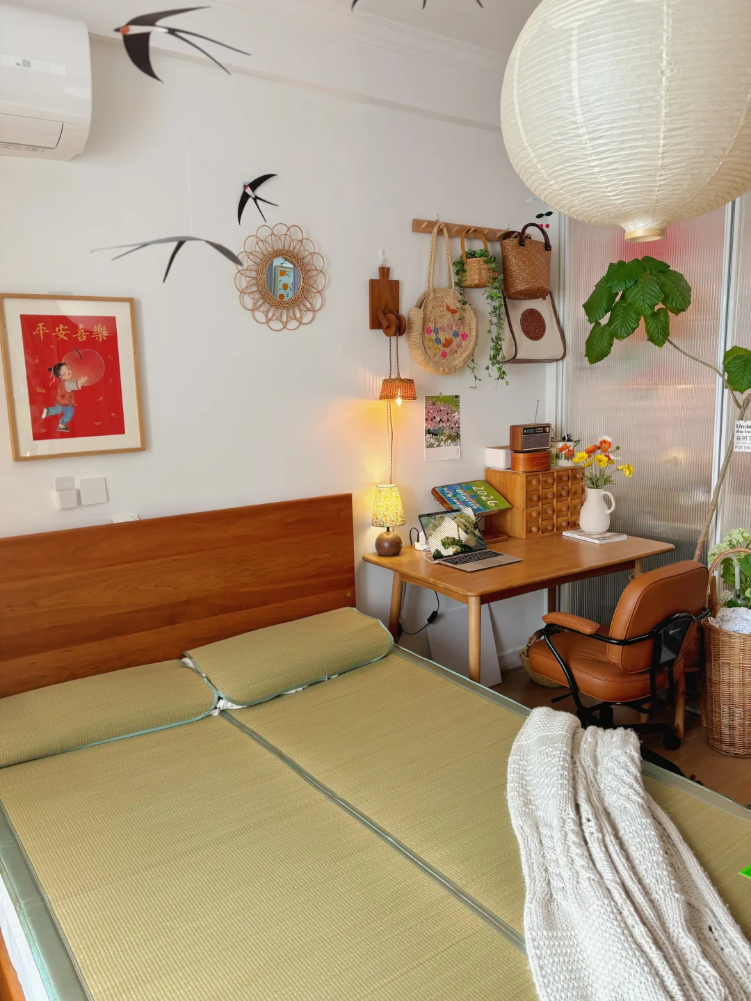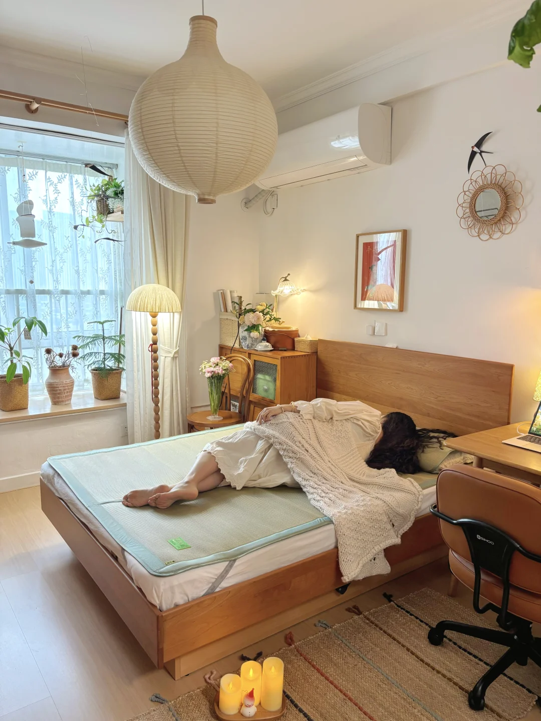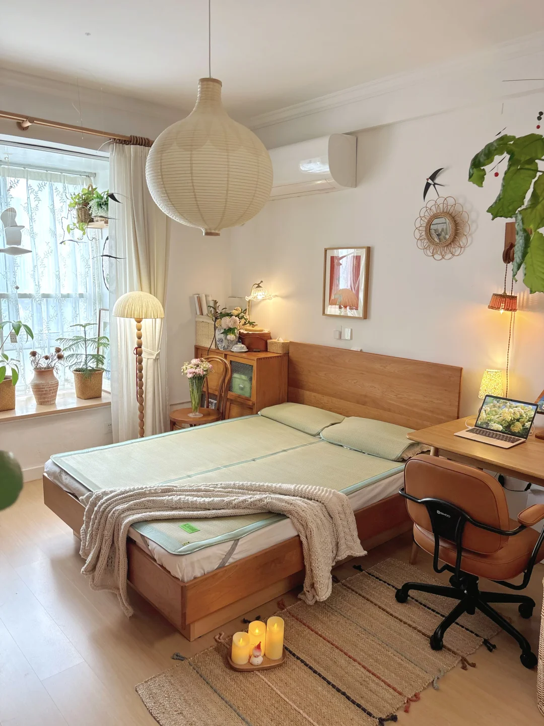 复古原木风卧室的凉席已就位