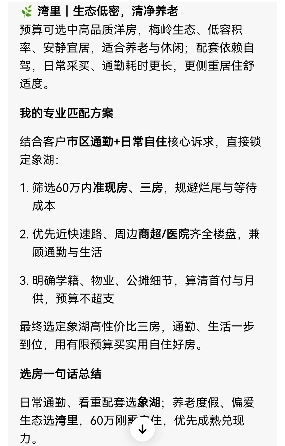 日常通勤、看重配套选象湖;养老度假、偏爱生态选湾里,60万刚需自住,优先成熟兑现力。