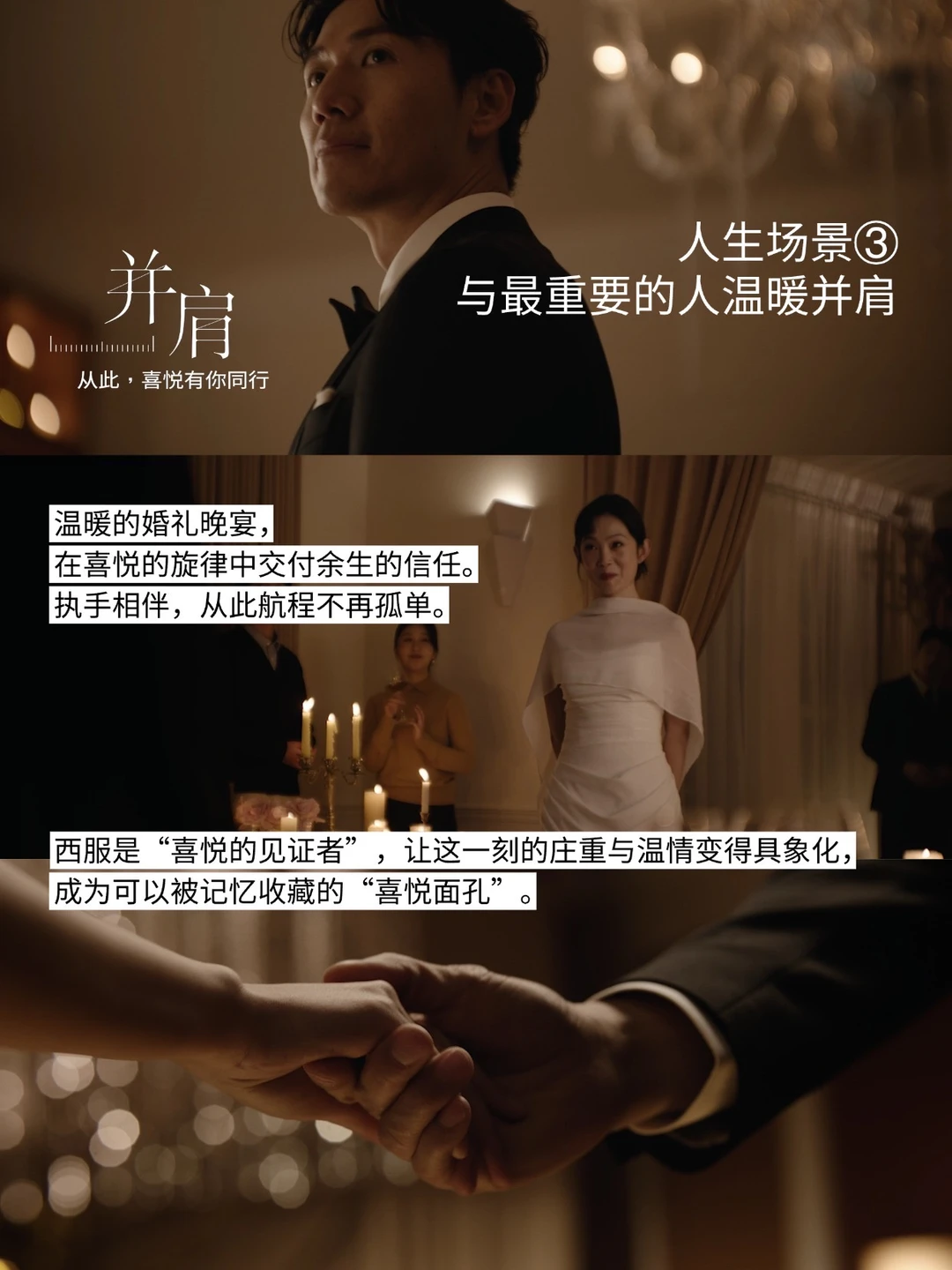 整理领带、抚平衣角,这些日常动作被赋予了一种近乎仪式的庄重——是进取,也是从容。光影的色调,随着一位男士走过人生五个关键节点悄然流转,从冷硬走向温暖,映照出一个人从青涩到从容的人生轨迹,报喜鸟如影随形,始终同行。