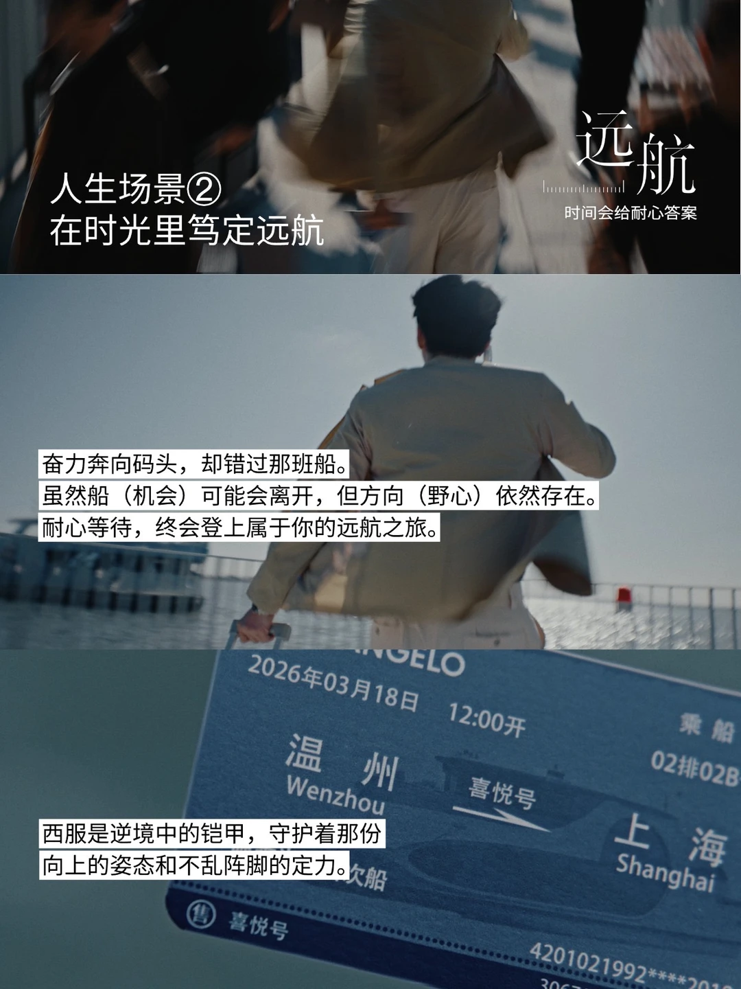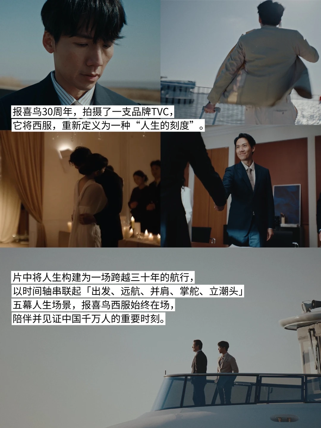 🔵片中将人生构建为一场跨越三十年的航行,以时间轴串联起出发、远航、并肩、掌舵、立潮头五幕人生场景,报喜鸟西服始终在场。西服不只是衣物,而是一种陪伴,一种见证,一个穿越山海、也穿越内心的坚定力量。