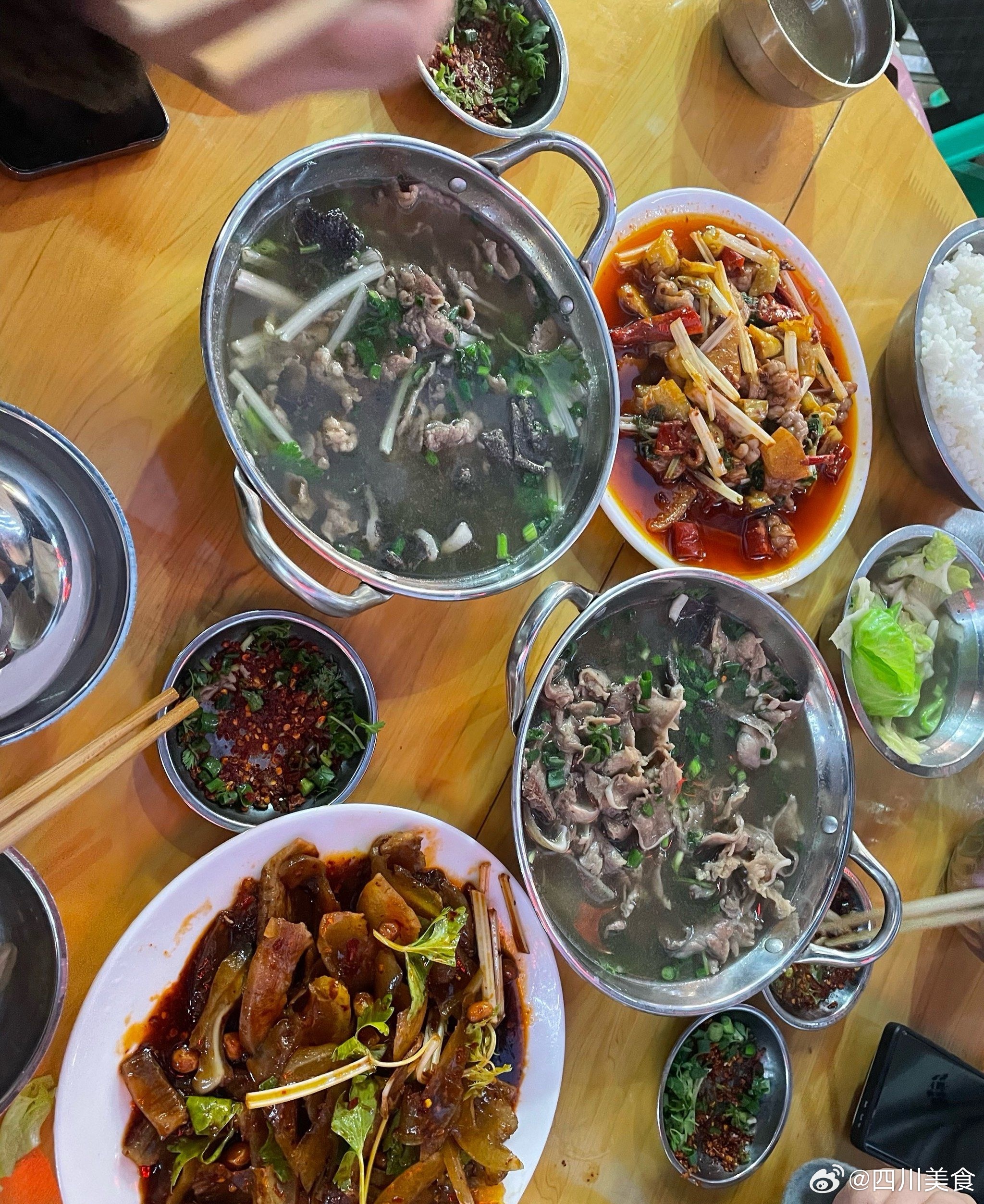 乐山正宗苏稽翘脚牛肉馆:一大锅里面全是扎扎实实的肉,有牛肉、牛杂可以拼,汤很鲜,牛肉烫的比较嫩,毛肚烫得很脆,蘸料香蘸啥都好吃,还有免费的水煮菜。