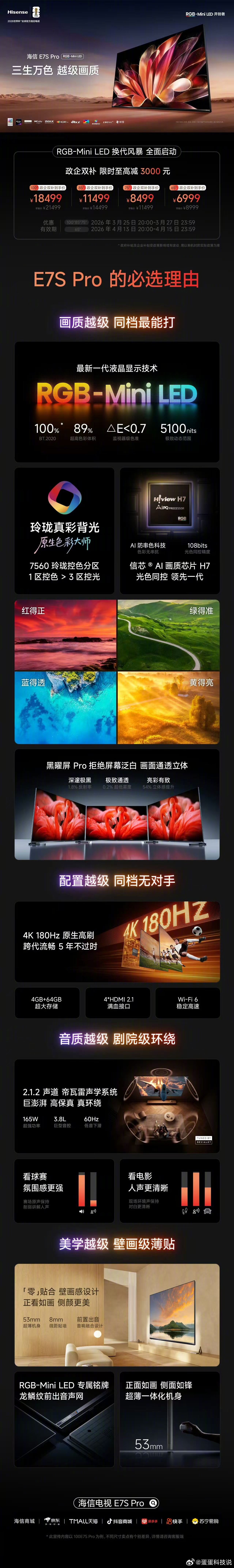 海信电视E7SPro 早在海信UX2026身上,我们便见证过信芯AI画质芯片的魅力,其赋予了画质智慧,让硬件性能得到极致释放,实现了暗场光晕消融与亮场色彩饱满的双重优势。现在同样芯之下的海信E7SPro更是凭借6999元起的价格开启海信RGB-MiniLED换代风暴,大家看好吗?