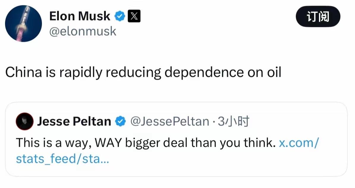 当地时间3月9日,特斯拉创始人马斯克发文表示:“中国正在迅速减少对石油的依赖。”   放在几年前,谁也不敢想象,中国能在减少石油依赖这条路上走得如此迅猛,毕竟那时我们的石油对外依存度常年居高不下,很多工业生产、交通运输都离不开石油,甚至一度让人担心能源安全会被“卡脖子”。   但短短几年时间,一切都发生了翻天覆地的改变,这种变化,不仅体现在日常出行中,更渗透到了能源生产、工业发展的每一个角落。最直观的变化,就是我们身边的汽车。   以前走在马路上,看到的几乎都是烧汽油、柴油的燃油车,而现在,新能源汽车随处可见,无论是家用轿车、网约车,还是公交车、货车,越来越多的车型换成了电动的。   有数据显示,2025年我国新能源乘用车的销量已经占到了新车销量的一半以上,每卖出两辆新车,就有一辆是新能源汽车,与此同时,汽油销量也出现了历史上第一次实质性下降,同比减少了5.7%。   这一升一降的鲜明对比,正是中国减少石油依赖最真实的写照,毕竟交通领域的石油消耗,曾经占了全国石油总消耗的很大一部分。   除了交通领域,能源生产端的变化也同样令人惊叹。我们不仅在减少石油的使用,更在努力用清洁能源替代石油,其中光伏产业的发展最为突出。   中国作为全球最大的太阳能生产和消费国,2025年新增的太阳能装机量持续攀升,光伏发电的成本也大幅降低,越来越多的地方建起了光伏电站,甚至很多农村地区,家家户户的屋顶都装上了太阳能板,既能自己用电,还能多余的电并入电网。   这种“太阳能发电+电动汽车用电”的模式,形成了一个良性循环,从根本上减少了我们对石油的依赖。而中国在减少石油依赖的同时,也在不断夯实自身的能源供应基础。   国家能源局明确提出,2026年要持续加大国内重点油气盆地的勘探开发,确保原油稳产,同时拓展海外进口合作,打造灵活的贸易体系,真正做到“能源的饭碗必须端在自己手里”。   不仅如此,国家还出台了税收优惠政策,降低油气勘探开发和天然气进口的成本,推动老油田转型,比如玉门油田,曾经是资源枯竭的老油田,如今转型发展光伏产业,实现了18年来首次扭亏为盈。   中国减少对石油的依赖,从来不是一蹴而就的,也不是盲目跟风,而是国家长远规划的结果。从“十五五”规划明确推动石油消费达峰,到四部门严控炼油产能、推动炼油行业绿色转型,再到大力发展新能源、完善能源体系,每一步都走得扎实稳健。   马斯克作为新能源领域的领军人物,之所以能敏锐地发现这一变化,正是因为中国在新能源领域的发展速度和成就,已经走在了世界前列。   曾经我们依赖石油,是为了发展;现在我们减少石油依赖,是为了更好、更可持续地发展。这种变化,不仅改变了我们的生活方式,更守护了国家的能源安全,也为全球能源转型提供了中国方案。   相信在未来,中国还会在减少石油依赖的路上继续前行,带来更多令人惊喜的变化。