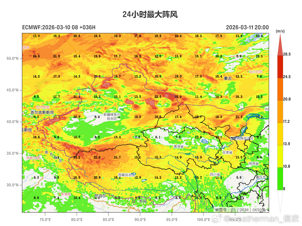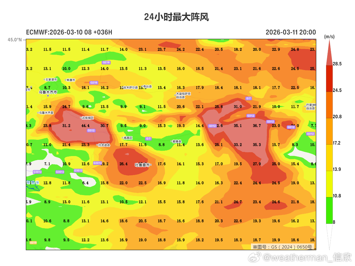 图1为今晚到明天的阵风预报,图2为区域放大,在达坂城南边,数值预报给出44.4米/秒,这个风速有14级(强台风级)。图4-5为明晚-后天的阵风预报。在十三间房一带,阵风有36-37米/秒,也有12-13级(台风级)。如此强风,开车要警惕侧翻。同时大风吹起沙尘,能见度也差,总之最好减少非必要的外出。