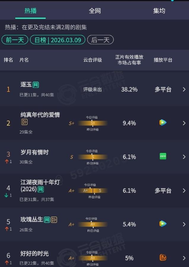 《逐玉》云合播放量破8000万! 《逐玉》开播第三天,云合占比达到38.2%,日播放量8000万集均达2000万,看架势,这剧的云合集均是奔着8000万档去的,虽然都在说这部剧水,但是这部剧的热度和播放量是匹配的,大部分剧只能水热度,播放量远远达不到破万标准,腾讯破万日最低播放量是《骄阳似我》的3800万云合播放量,爱奇艺最低破万日是《唐诡》的4300万云合播放量,《逐玉》双平台8100万播放量,但双平台都暂未破万,如果非要说这部剧数据造假,那人家造的足够完美,热度和播放量做得很匹配。
