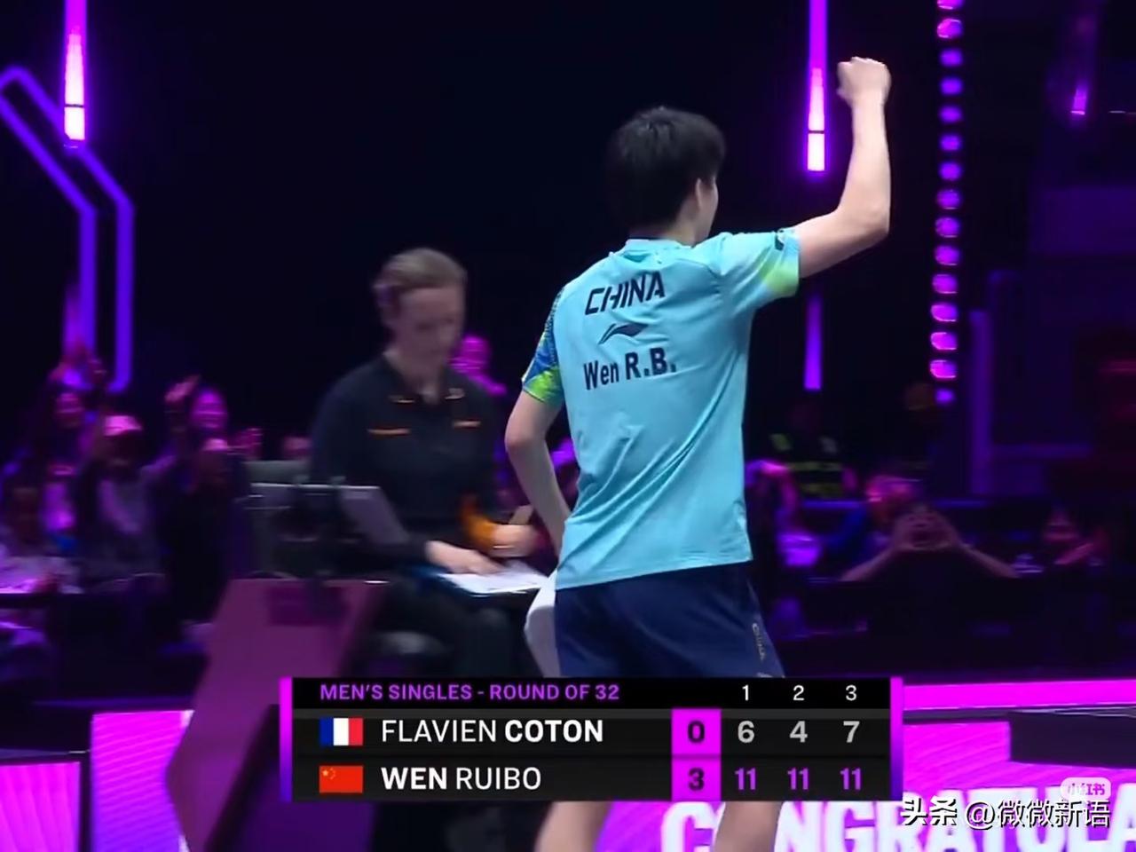 温瑞博今天的场外是刘恒,志强教练没有上场,志强教练在场外坐着看温瑞博打比赛,温瑞博3-0赢了科顿,之前志强教练给温瑞博做场外,小温经常打满局。今晚温瑞博确实打的好,关键球也非常敢出手,下一轮比赛温瑞博将对阵小莫,刚刚小莫是3-0赢了林德,温瑞博继续加油哦。 今天晚间国乒只有这一场男单的比赛,周启豪、温瑞博晋级男单16强。前段时间,温瑞博一直在欧洲打比赛,进修后确实不一样啊,温瑞博对上欧洲的选手时,打的还是不错的,下一轮对莫雷加德,还是要做好困难准备的,小莫打球变化比较多,而且近期的状态也不错,希望小温可以突破自己。 今晚的比赛,看到王皓、肖导、志强、秦志戬都在那里看温瑞博打比赛,徐瑛彬、薛飞、黄友政也都在场外给温瑞博加油,在赛后采访中,温瑞博说看到我们这么多人都在,看到他们后很安心,能够给他动力,也给他增加了信心。小温采访的时候说的也很好,他确实打球也有拼劲儿,希望能够多打几轮。