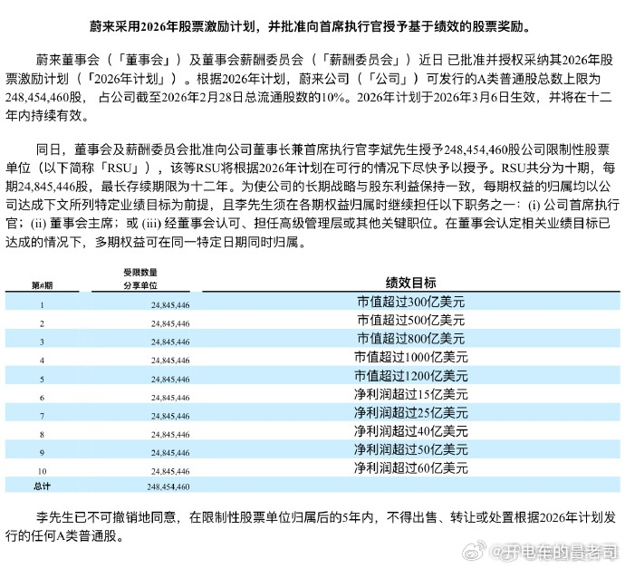 根据该计划,首席执行官李斌将获得248,454,460股限制性股票单位,分十期等额授予,其归属取决于是否达成特定的市值和净利润目标。市值目标范围为300亿至1200亿美金,净利润目标则从15亿至60亿美金不等。李斌须在每次归属时保持其高级管理职位