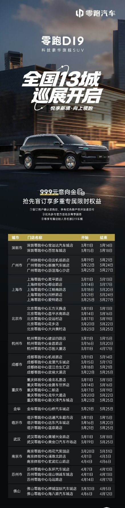 零跑D19,终于开始有动静了!全国13城巡展,挺好。之前动静挺大,有好长一段时间又消停了,现在临近上市了宣发节奏又上来了。零跑D19,是目前六座SUV关注度比较高的车型,热度不能降低。第二代VLA,宁德时代大电池,1280TOPS算力,零跑D19这些优势,需要一个不膨胀的价格去激活产品力,才能皈依零跑好卖的道道。百家车坛