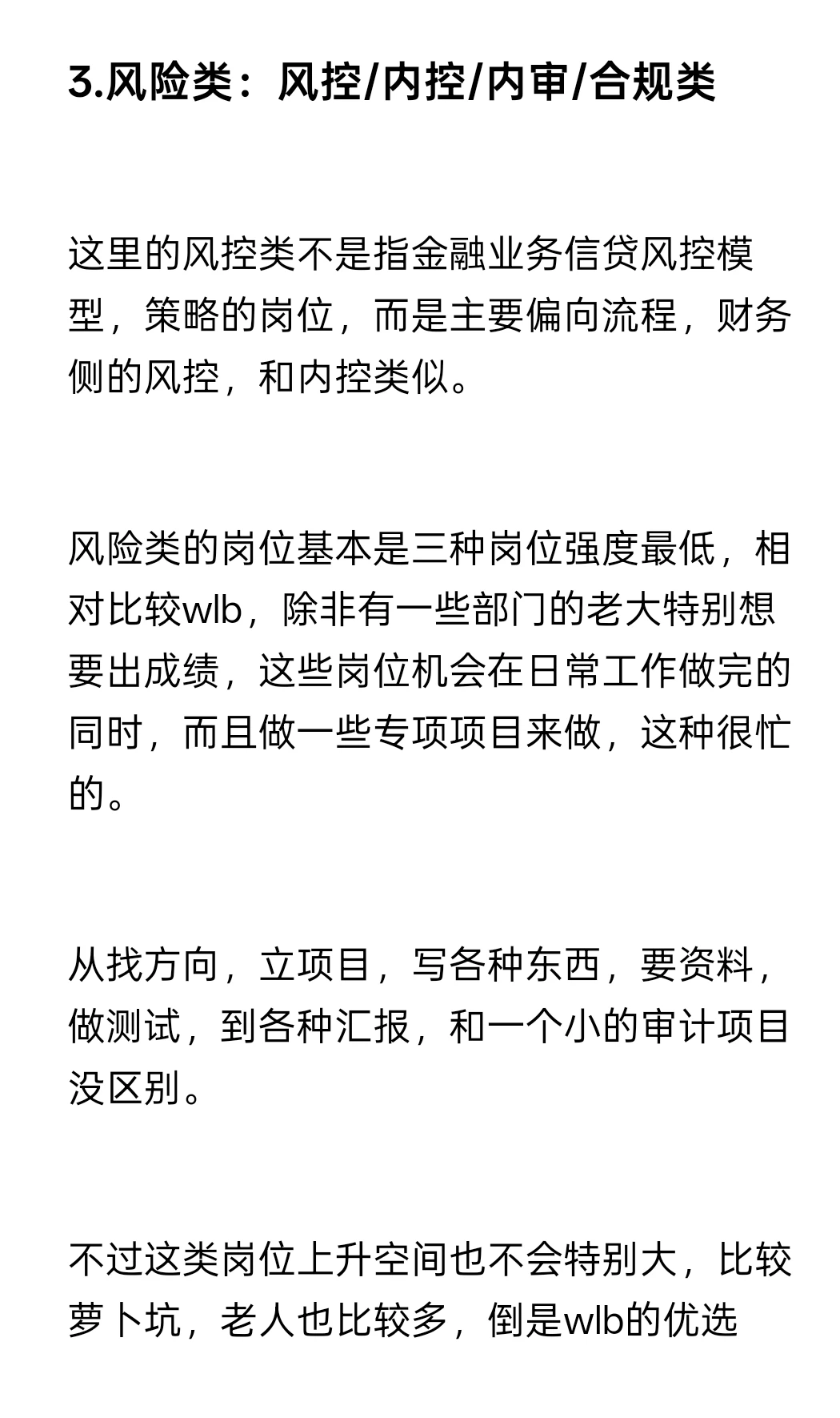 风险类的岗位基本是三种岗位强度最低,相对比较wlb,除非有一些部门的老大特别想要出成绩,这些岗位机会在日常工作做完的同时,而且做一些专项项目来做,这种很忙的。