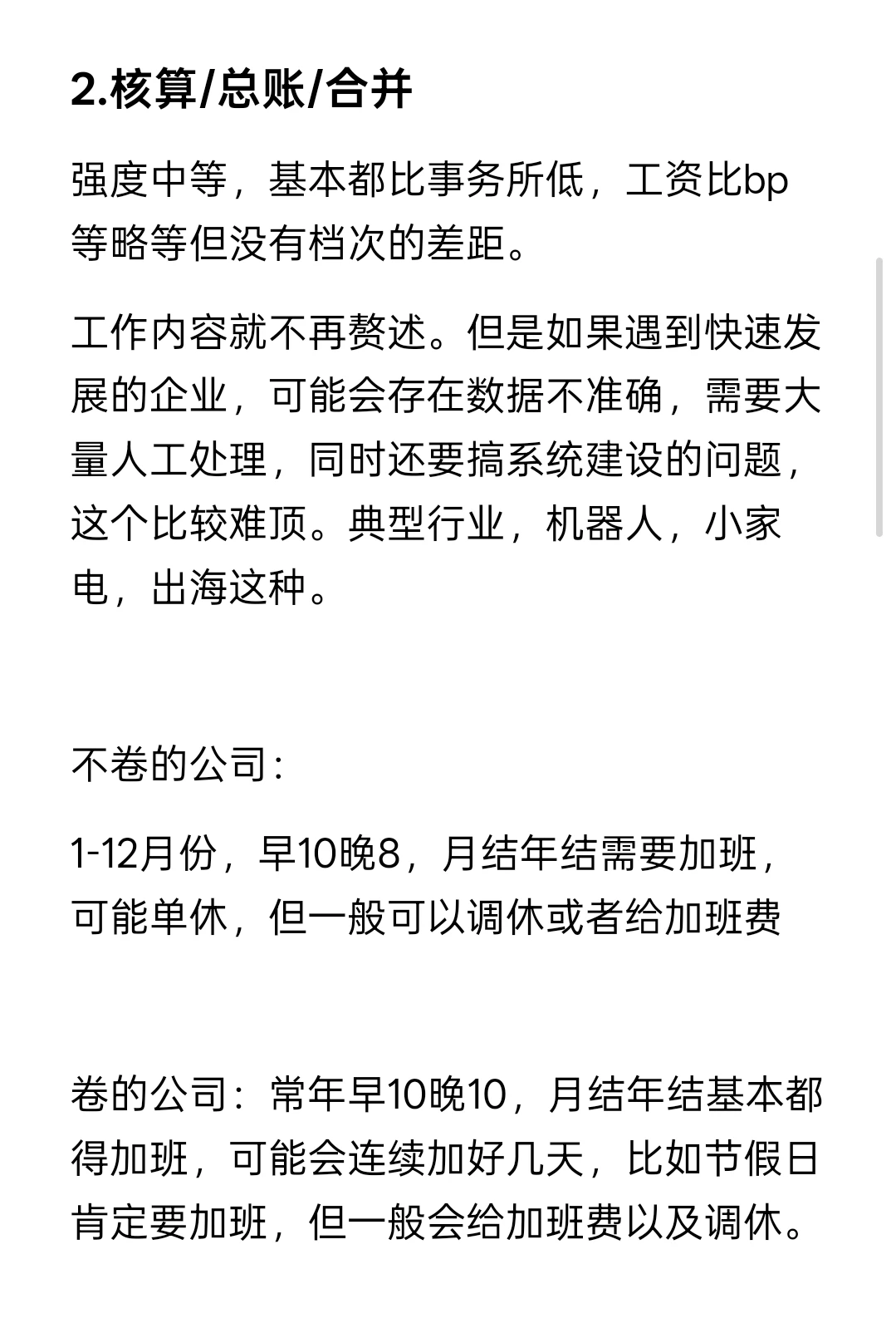 工作内容就不再赘述。但是如果遇到快速发展的企业,可能会存在数据不准确,需要大量人工处理,同时还要搞系统建设的问题,这个比较难顶。典型行业,机器人,小家电,出海这种。
