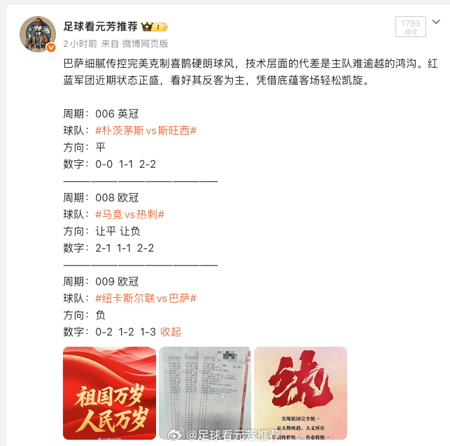 周期:006 英冠球队:朴茨茅斯vs斯旺西方向:平数字:0-0 1-1 2-2—————————————————周期:008 欧冠球队:马竞vs热刺方向:让平 让负数字:2-1 1-1 2-2—————————————————周期:009 欧冠球队:纽卡斯尔联vs巴萨方向:负数字:0-2 1-2 1-3