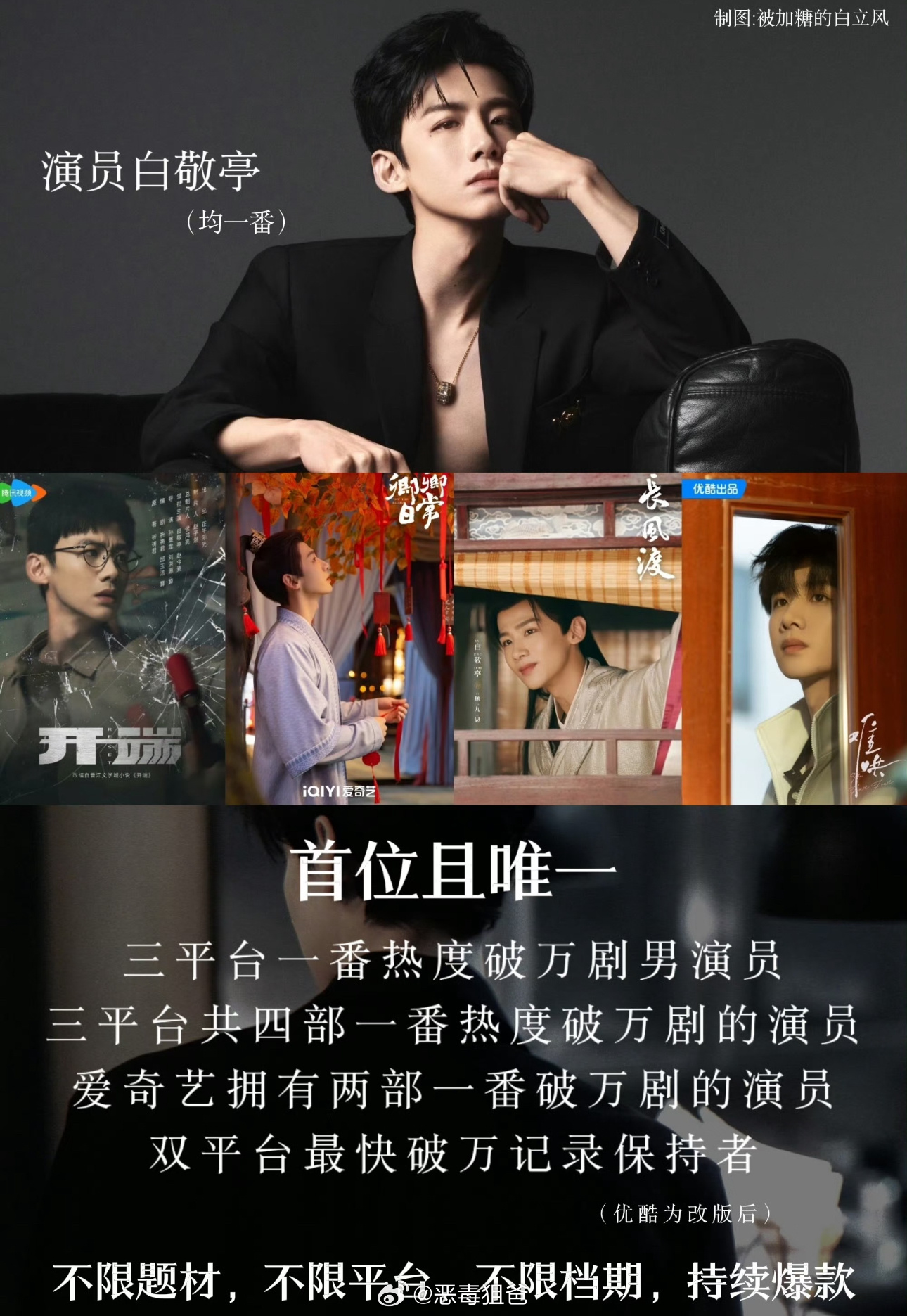 又要来夸一下这个白敬亭了 简直夯爆了而且这四部集均很可观首位且唯一一番三平台破万剧演员🏆首位且唯一拥有三平台四部破万剧演员🏆首位且唯一双平台最快破万记录保持者🏆四部一番破万剧:1️⃣🐧2022开年第一爆《开端》;2️⃣🥝2022年播放量全平台年冠、拉新年冠《卿卿日常》;3️⃣🥝41小时极速破万记录保持者、招商史亚、拉新年亚《长风渡》;4️⃣👖2025现偶题材暂年冠、海外大爆《难哄》,白敬亭凭借此剧获全球流媒体大奖视帝提名。