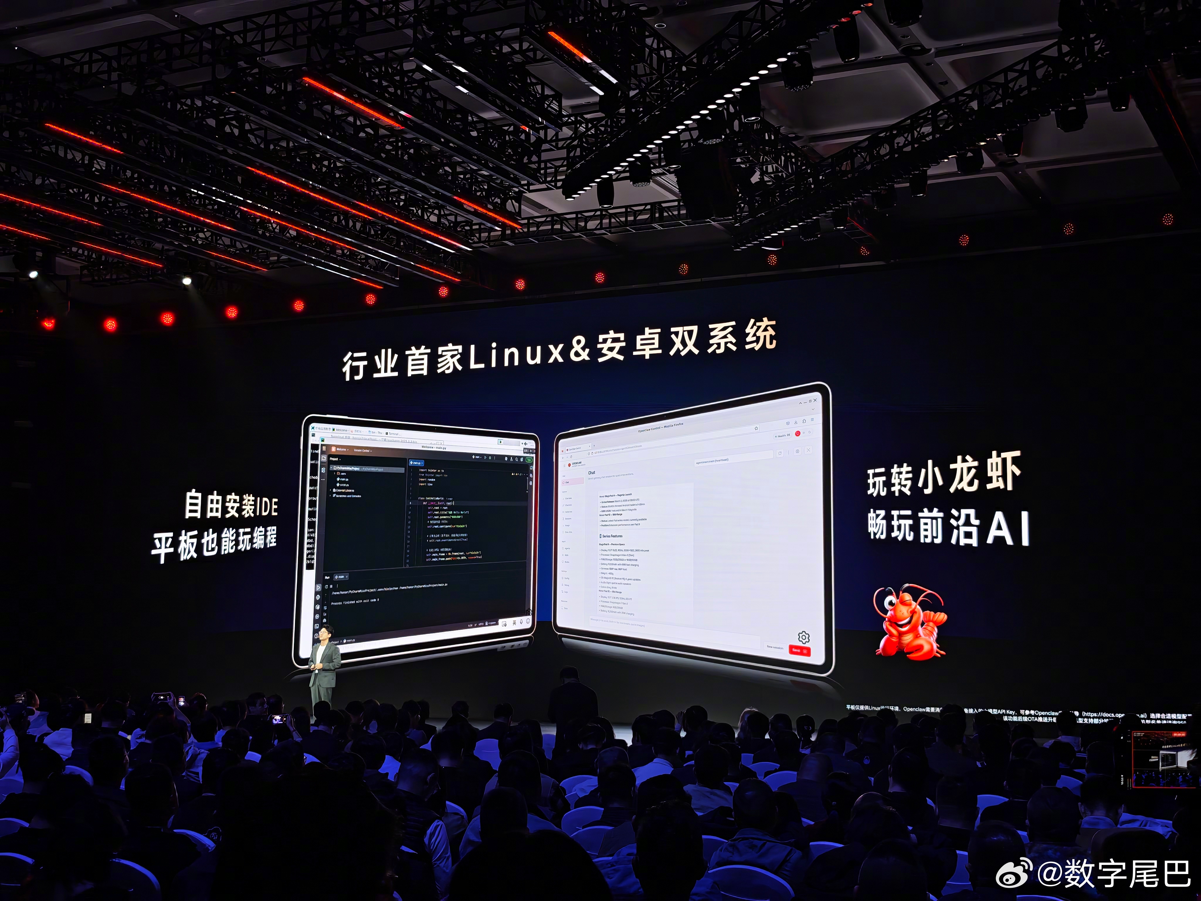耀子进度跟得快啊,将会实现行业首家 Linux 和安卓双系统平板,还会推出龙虾宇宙,以后可以在平板、手机、电脑和各种设备上实现养虾。