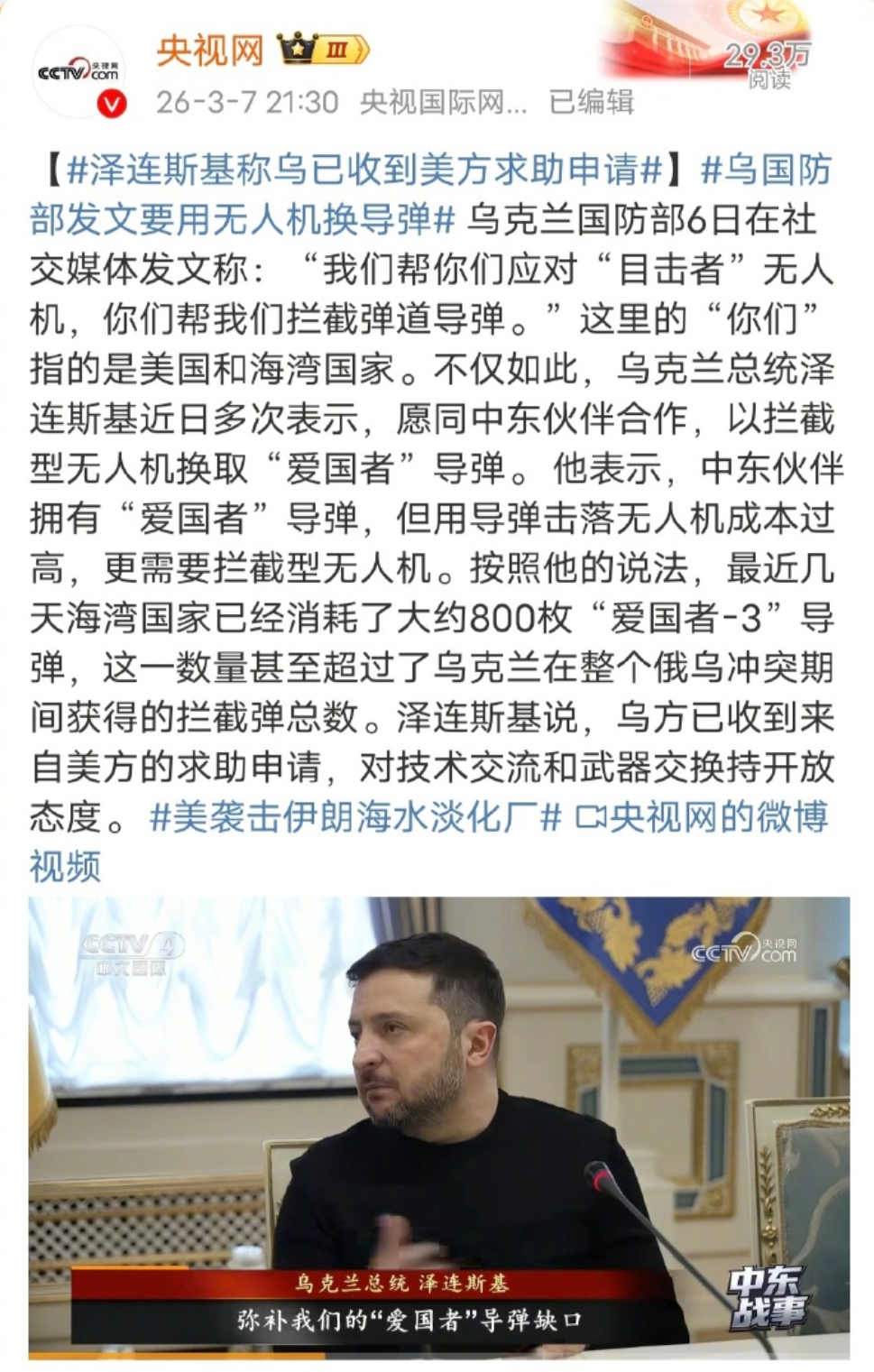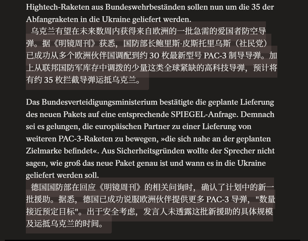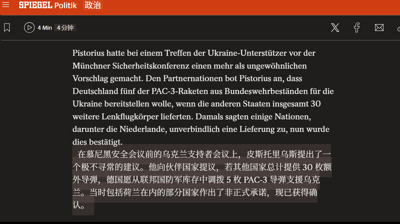 🔻有点难绷。🔻德国《明镜》说:德国国防部长皮斯托里乌斯从盟国库存中找到并协调了35枚PAC-3导弹(部分来自德国联邦国防军库存)给乌克兰——乌克兰将在未来几周内收到。🔻在慕尼黑安全会议前的乌克兰支持者会议上,皮斯托里乌斯提出:若其他国家总计提供 30 枚额外导弹,德国愿从联邦国防军库存中调拨 5 枚 PAC-3 导弹支援乌克兰。当时包括荷兰在内的部分国家作出了非正式承诺,现已获得确认。🔻泽连斯基之前抱怨海湾国家几天就打出去 800 多发……我要回伊朗我要保卫我的国家美国开始甩锅了海外新鲜事中东现场直击