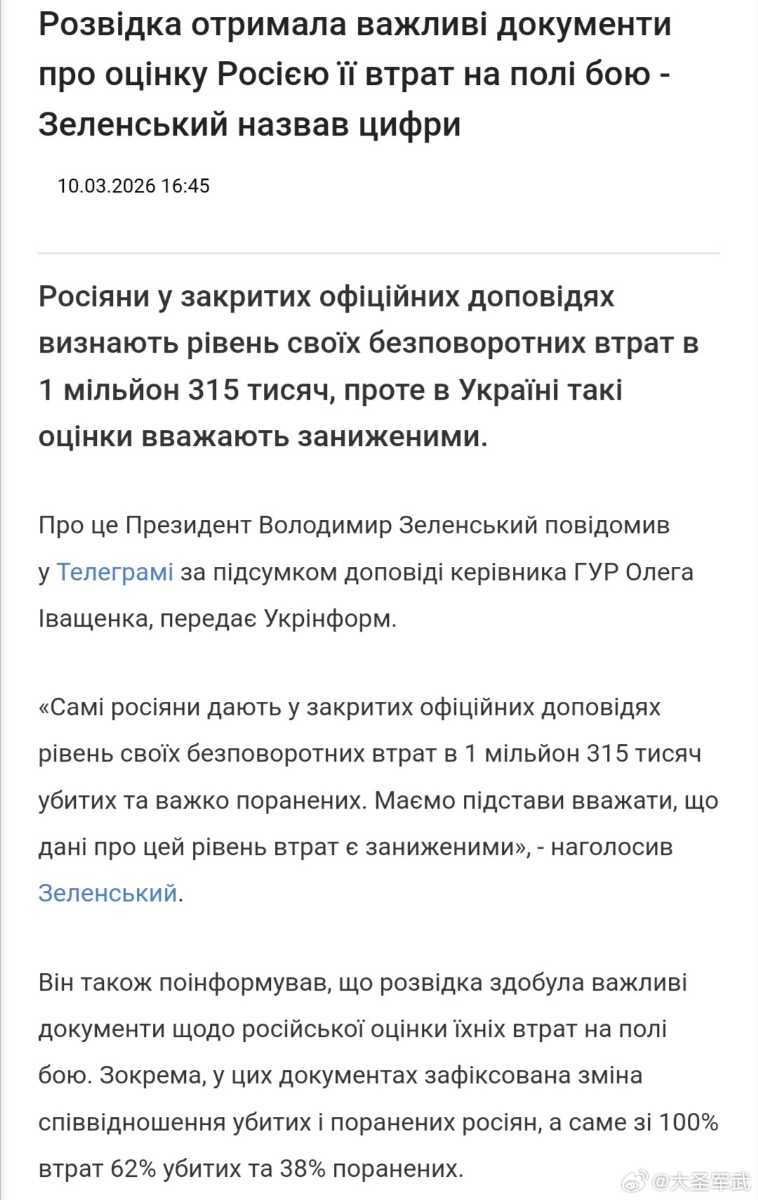 泽连斯基称,乌克兰🇺🇦情报部门获取了有关俄罗斯评估战场损失的文件,其中显示俄军不可挽回的损失为131.5万人(包括阵亡和重伤)。他还透露,文件记录了俄军伤亡比例的变化,目前是62%阵亡,38%受伤。 关注俄乌局势最新进展俄乌冲突四周年俄乌冲突