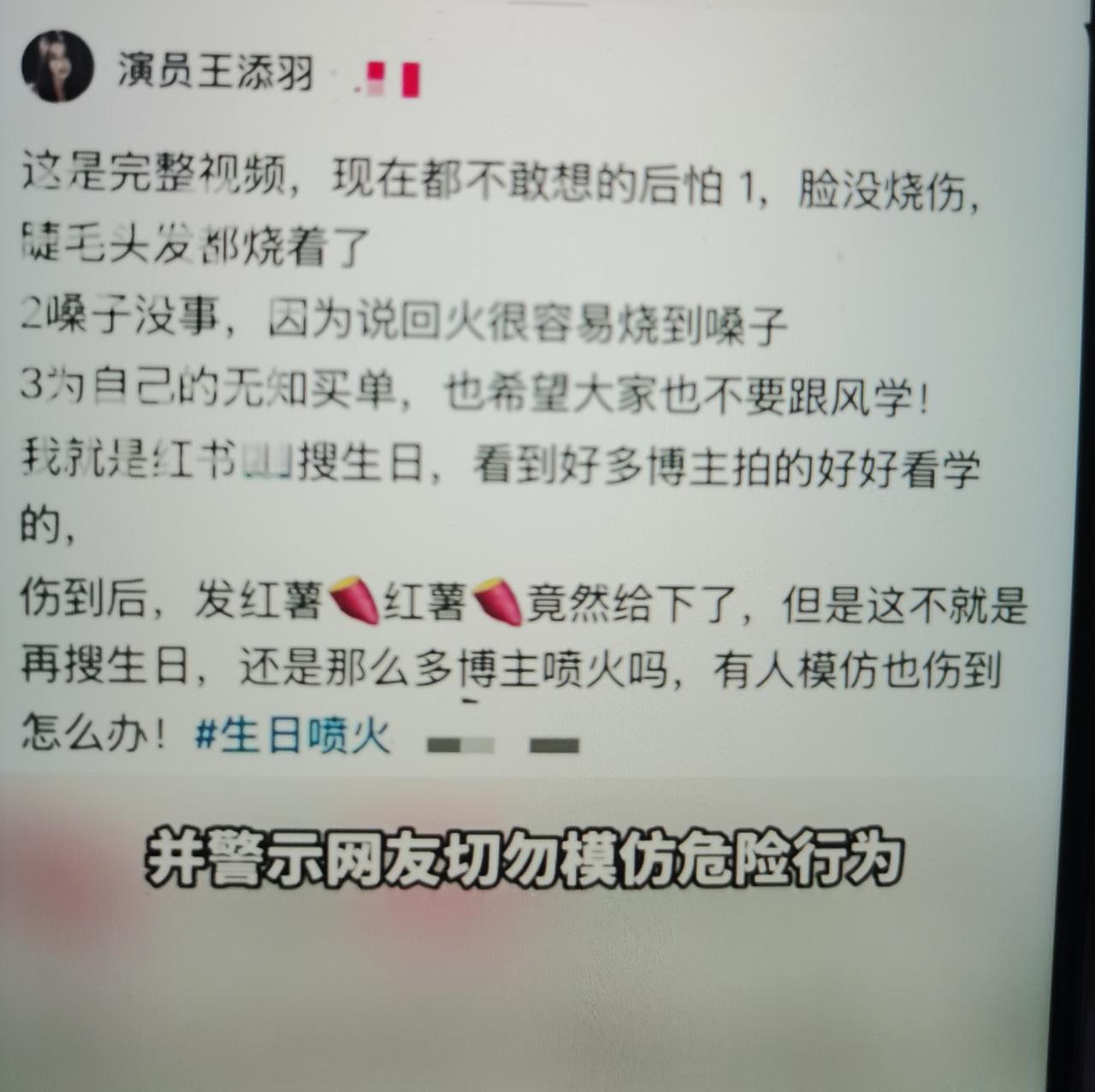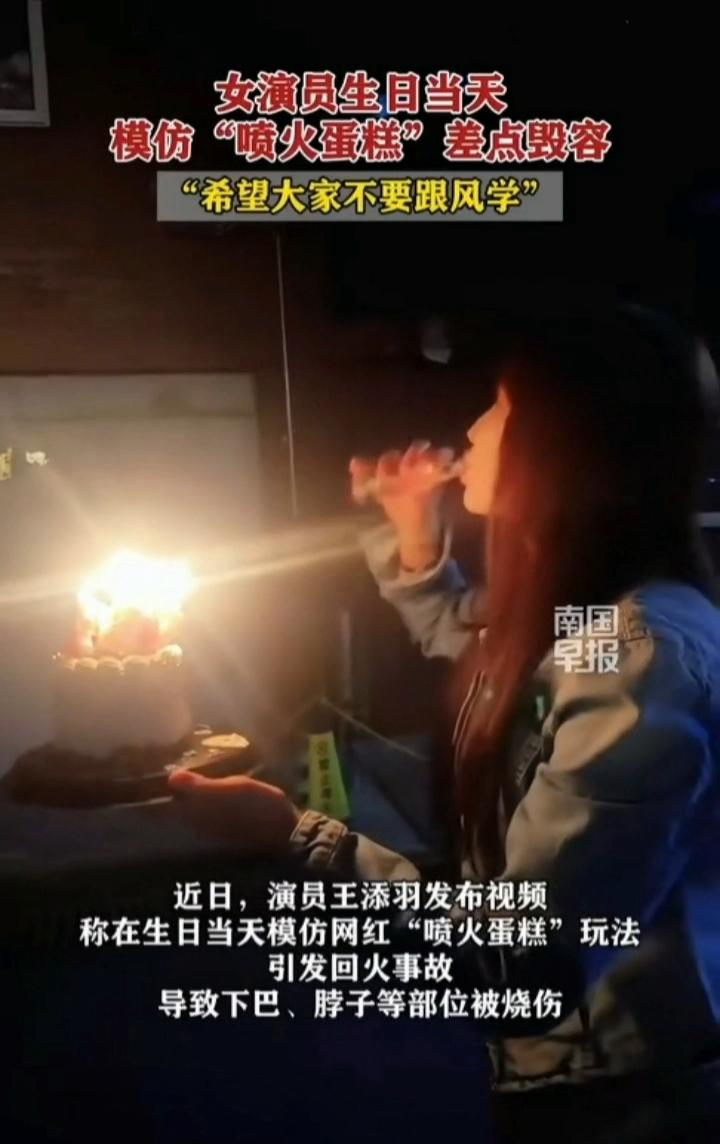 女演员王添羽生日当天模仿网红“喷火蛋糕”玩法,杯具了:她手里端着蛋糕,上面插着正在燃烧的蜡烛,随后她含了一口高浓度的酒喷向火苗,瞬间燃起火焰。 但是她嘴边残余的酒精造成火焰反向燃烧,一瞬点燃了前面的头发眉毛和睫毛,下巴和脖子多处被烧伤。她说“为自己的无知买单,希望大家不要跟风学”。 网上的很多视频炫酷都是专业人员表演和拍摄的,专业喷火表演,需要长期的训练和防护技巧,普通人不要盲目模仿,所有涉及到酒精,火等危险品的都需要谨慎再谨慎。