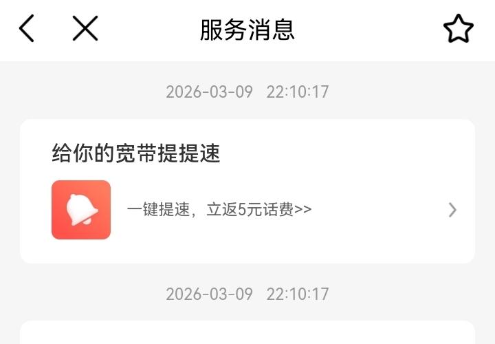 去年因为话费降套餐,前前后后两个月才整好的宽带,这两天感觉又不对劲,明显的感觉网速慢的出奇,打开个网页都需要好久。。。 但是明显的路由器工作是正常的,至少是没有反复重启,于是测了个速,结果果然是网速有问题。 然后又不小心看到有个服务消息,3月9号的:“给你的宽带提提速”,突然就有点明白这两天网速为什么这么慢了。。