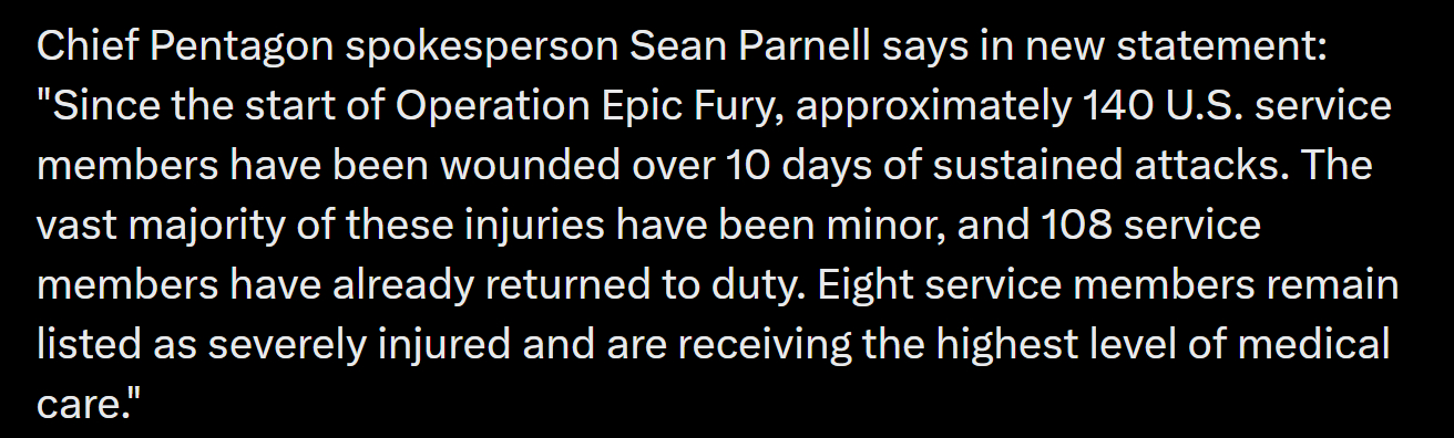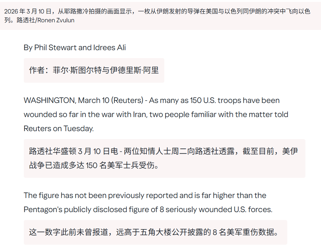 🔻路透社爆料:据两名消息人士向路透社透露,多达 150 名美军士兵在伊朗战争中受伤,这一数字远高于五角大楼公开披露的 8 名重伤者。🔻在路透社爆料后,五角大楼首席发言人肖恩·帕内尔在新声明中表示:“自‘史诗怒火’行动开始以来,约 140 名美军人员在持续 10 天的攻击中受伤。其中绝大多数伤势轻微,已有 108 名人员重返岗位。目前仍有 8 名人员被列为重伤,正接受最高级别的医疗护理。”🔻美国人信吗?我要回伊朗我要保卫我的国家 美国开始甩锅了 海外新鲜事 中东现场直击