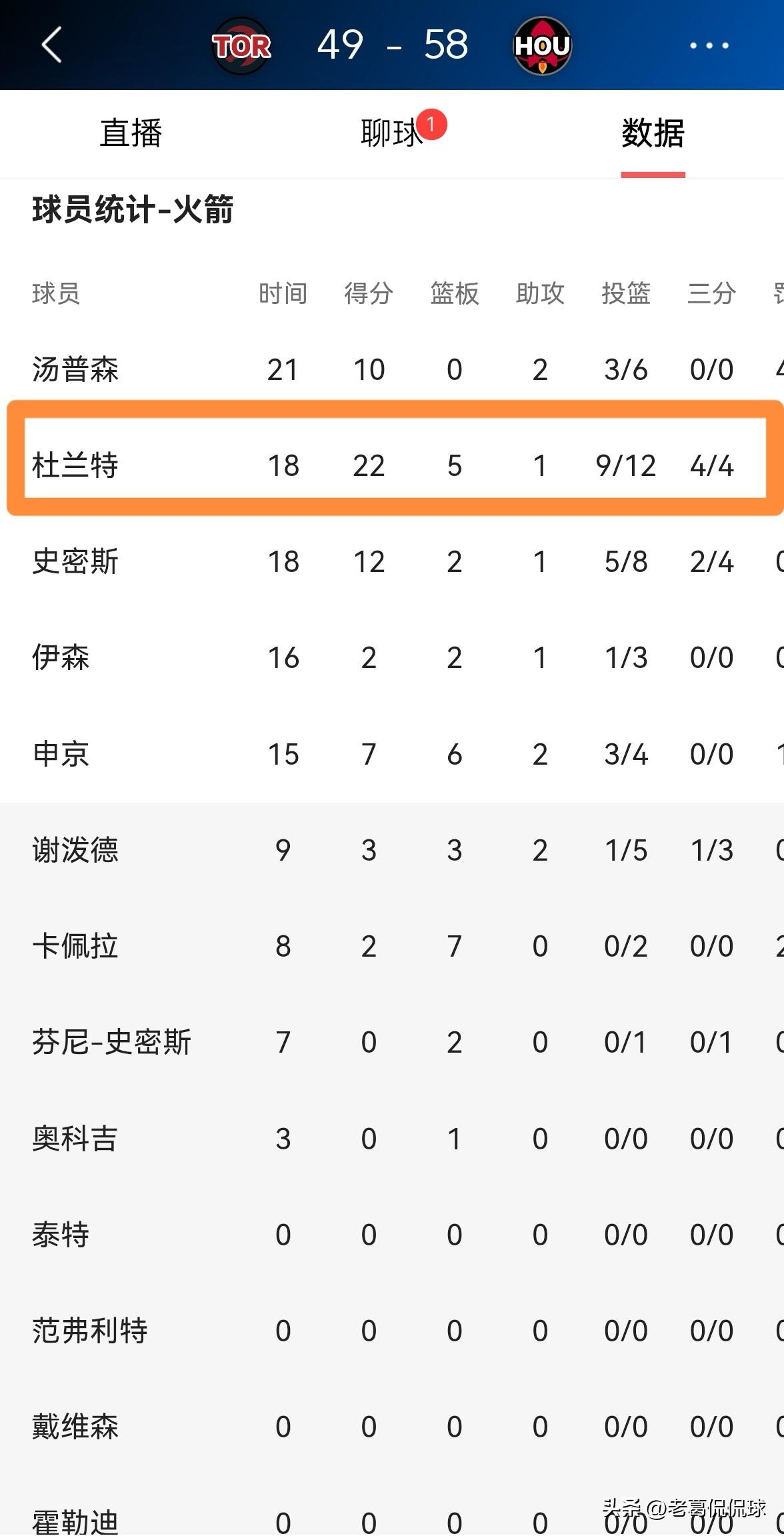 火箭巨星杜兰特的进攻效率真是吓死人了!在今天火箭主场迎战猛龙的比赛中,目前双方半场战罢,火箭凭借着杜兰特的无解表现以58:49领先对手9分。 在前两节比赛中,杜兰特的进攻效率特别的高,他在首发出战的18分钟里,投篮12中9,其中三分球4中4极其高效的砍下22分,还有5篮板1助攻2抢断1盖帽,他的场上正负值为+8。 作为一名37岁的老将,杜兰特依然能够在高强度的防守下打出这样高的进攻效率,真是吓死人了。