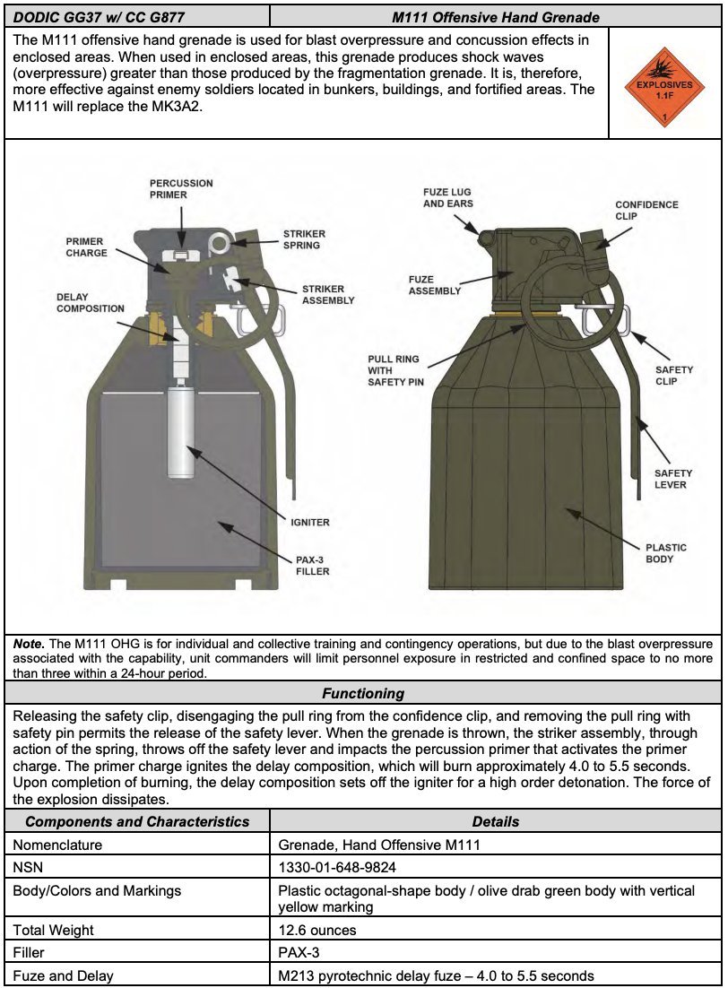 M111全重约357克,其中约112克为含铝HMX炸药(PAX-3),爆炸压力比早期铝化Comp A-3配方提高约20%。弹体采用可在爆炸中消耗的塑料壳体,并使用与M67相同的M213引信,便于统一生产与保障。