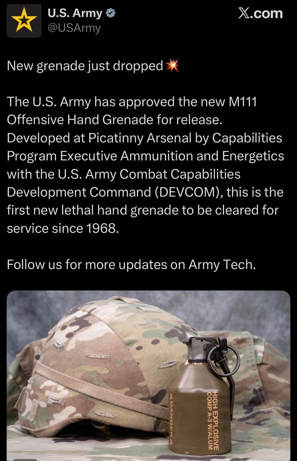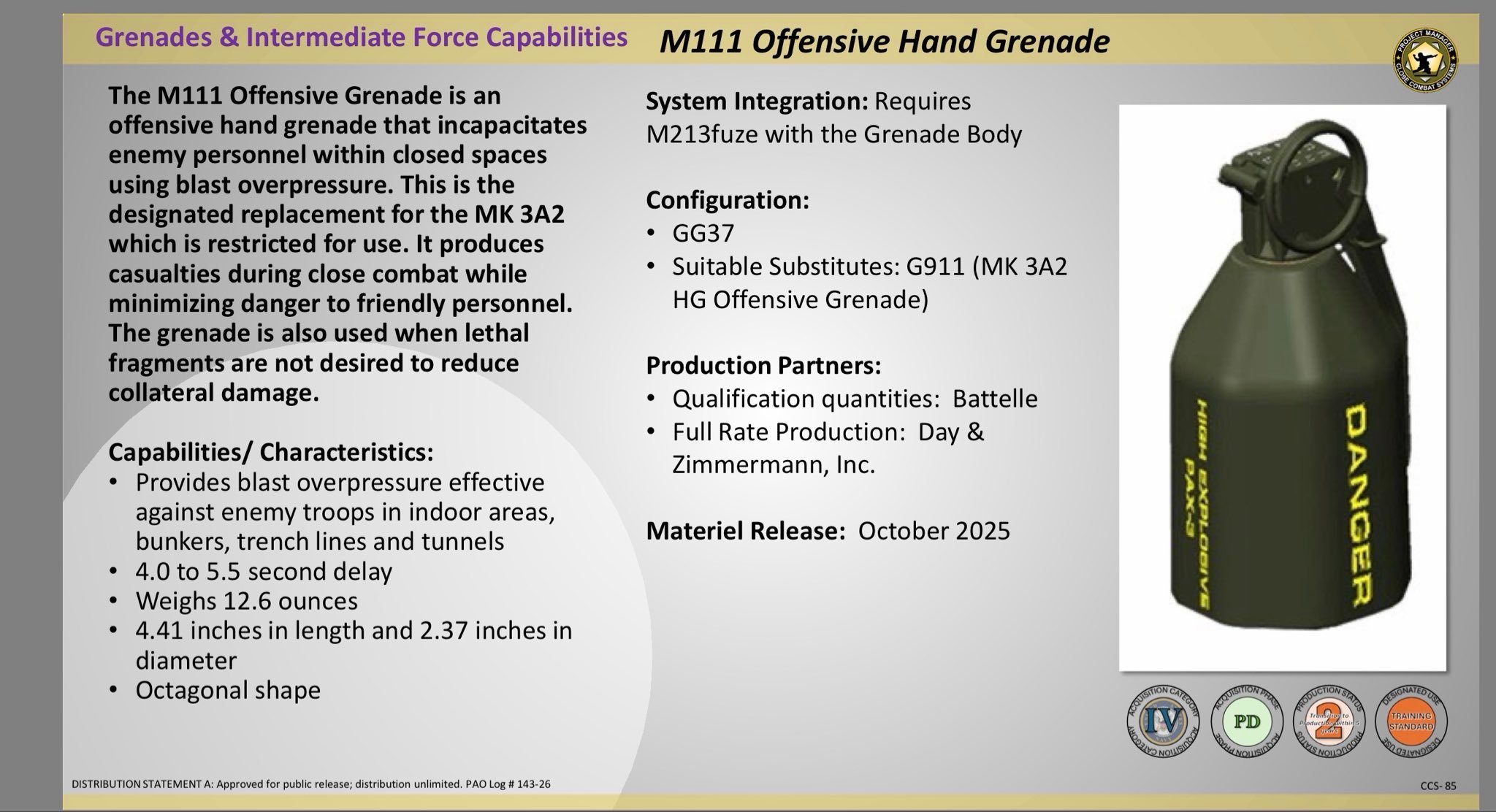 该手榴弹已获得全面装备放行,意味着在完成安全与性能测试后,美军可正式批量生产并向部队部署。