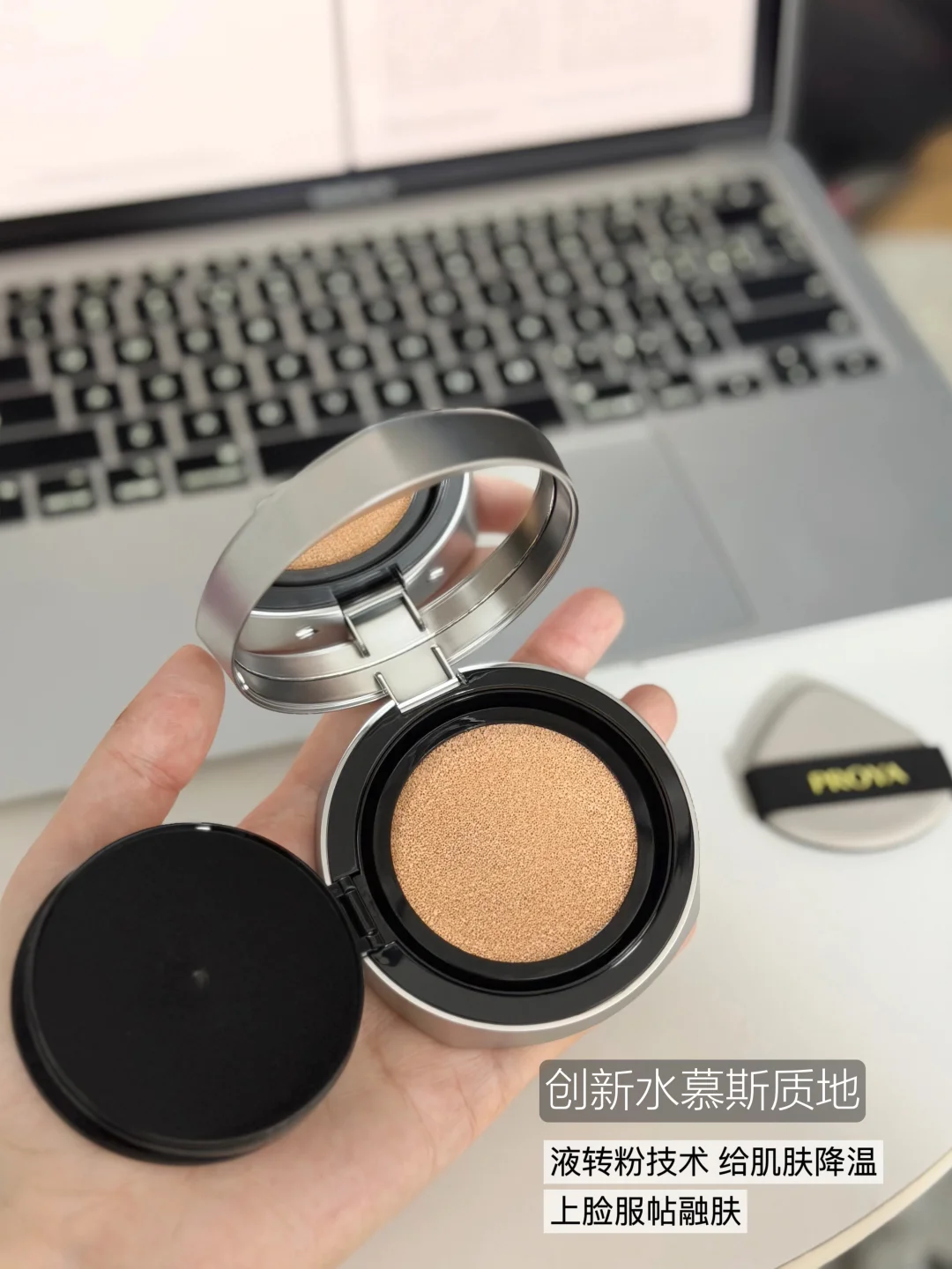 最让人惊喜的是它的上脸凉感体验,夏天上底妆最怕闷脸发烫,这款气垫的降温肤感特别舒服,重点是和市面上像其他气垫那种靠酒精挥发带来的凉感完全不同,珀莱雅做到0酒精添加,全靠创新水慕斯质地带来持久的清透凉感,哪怕气垫放了很久,每次上妆依旧冰冰凉凉,液转粉技术一拍扒脸,融肤不闷还巨服帖。