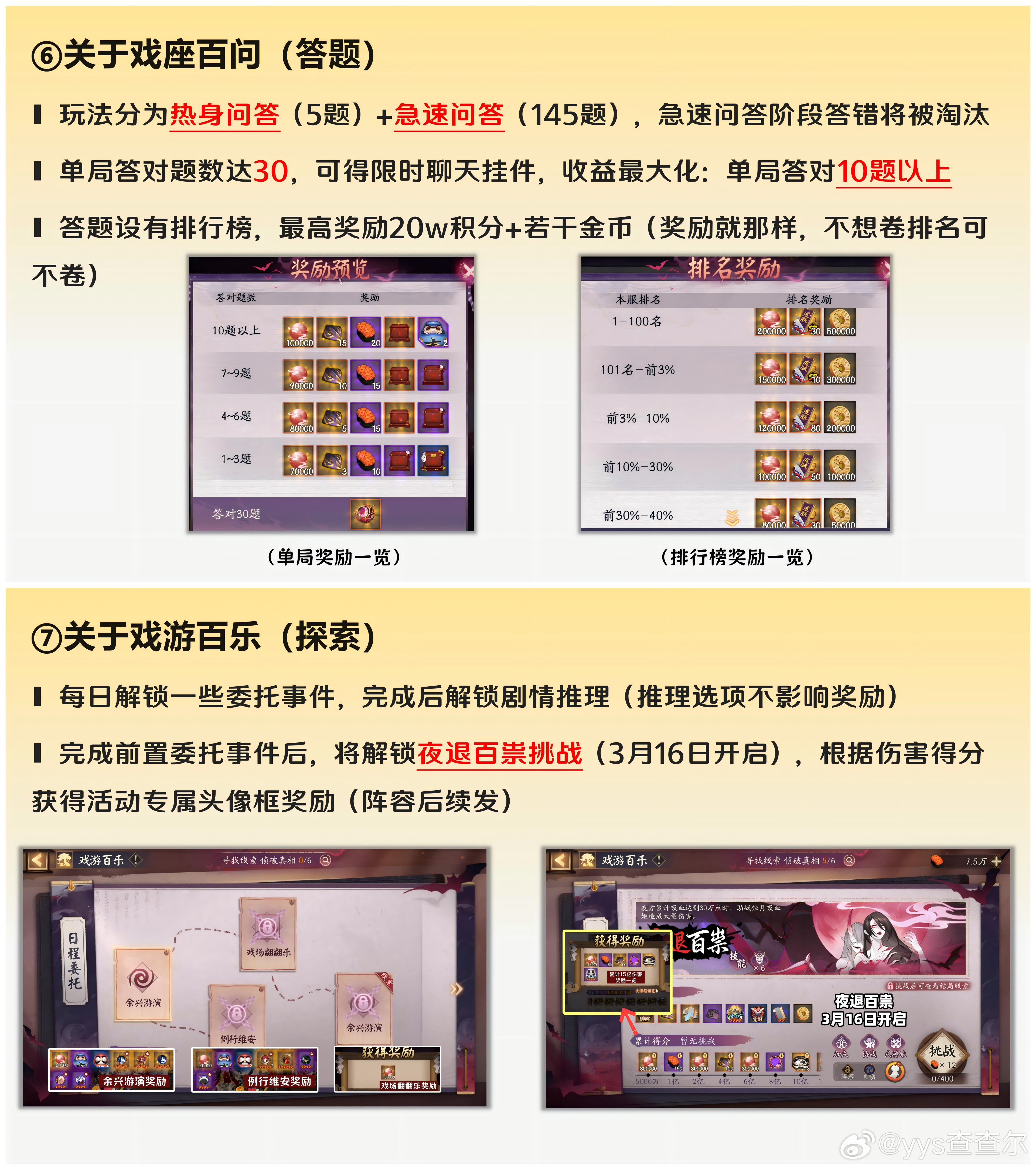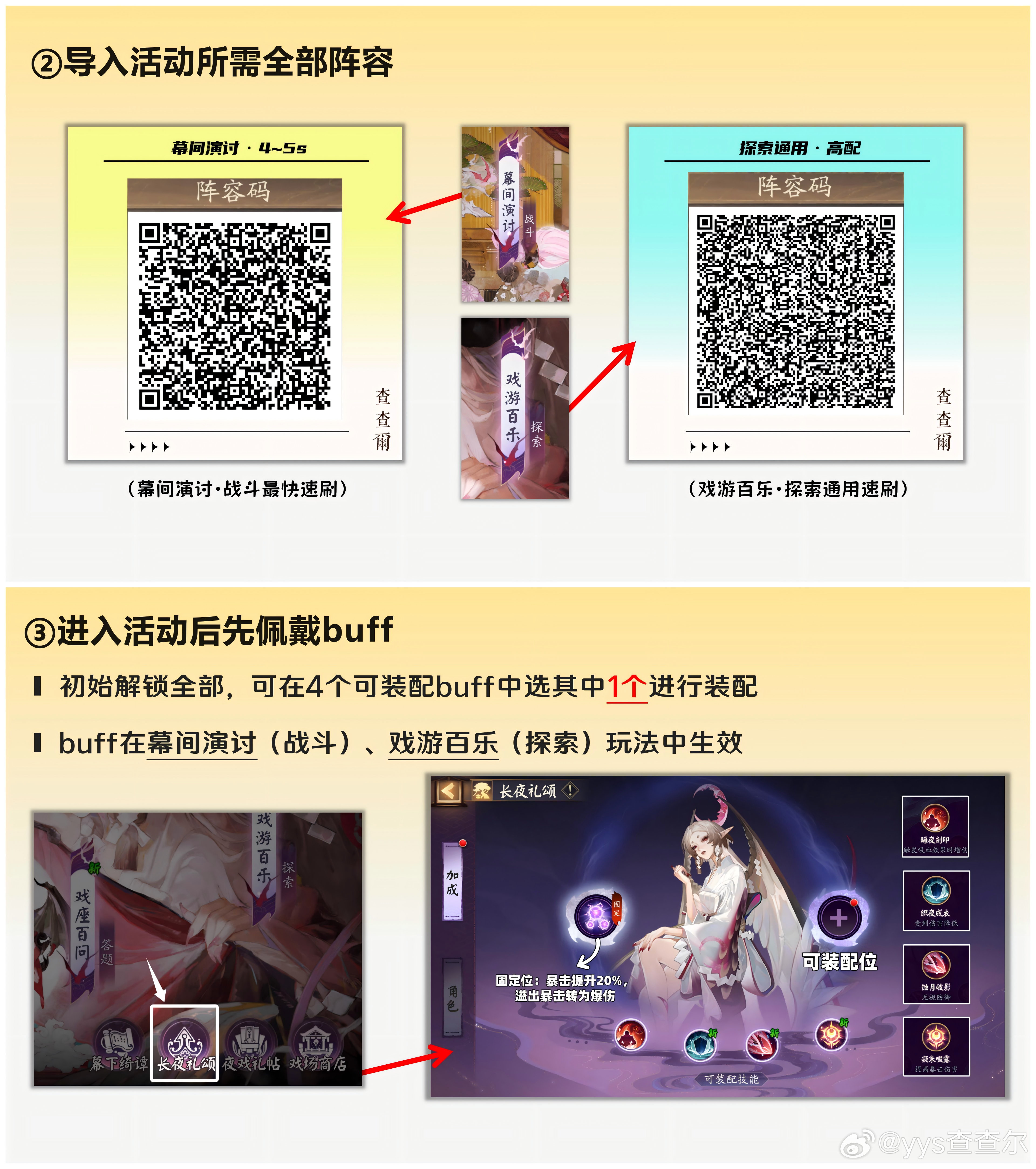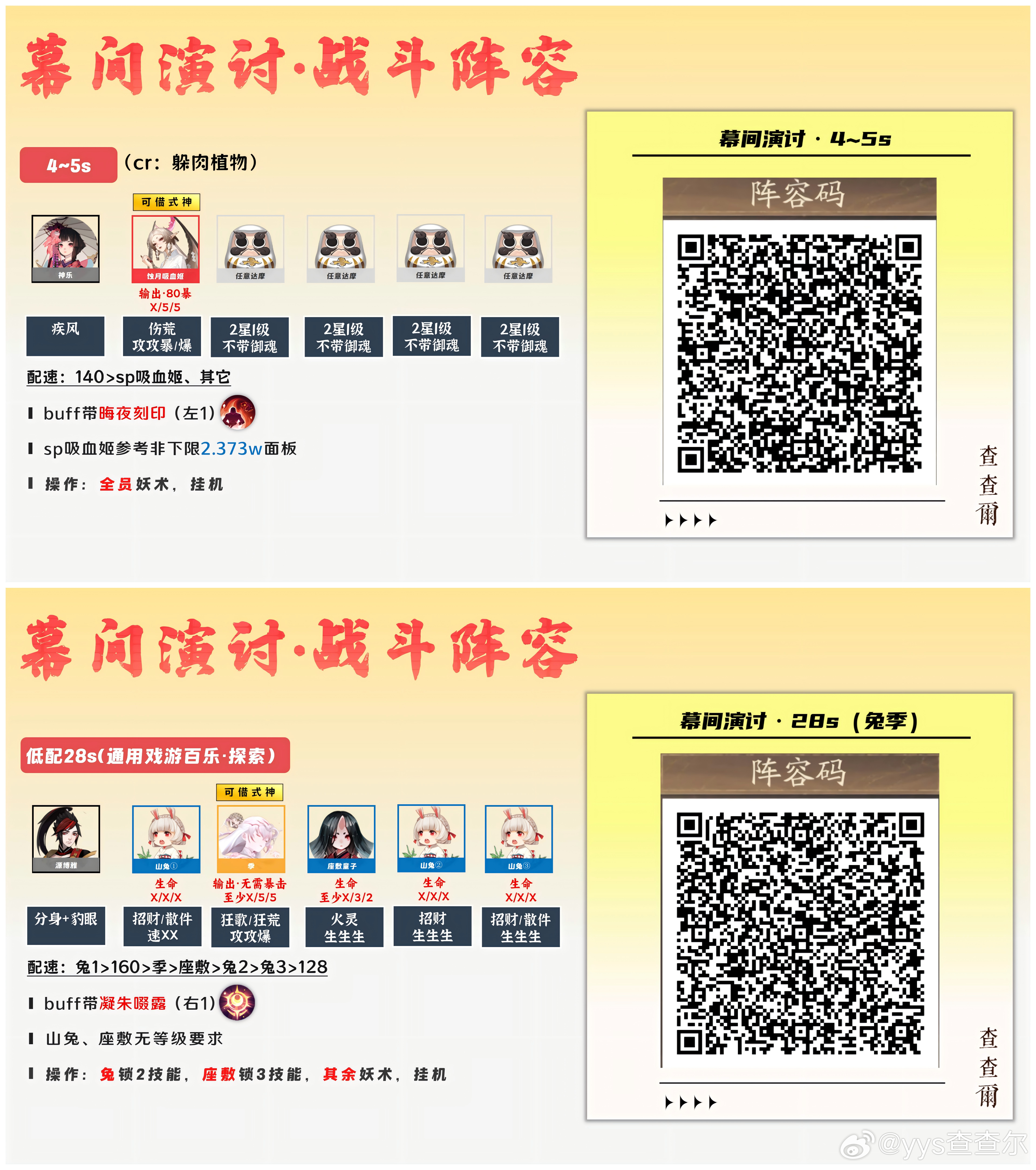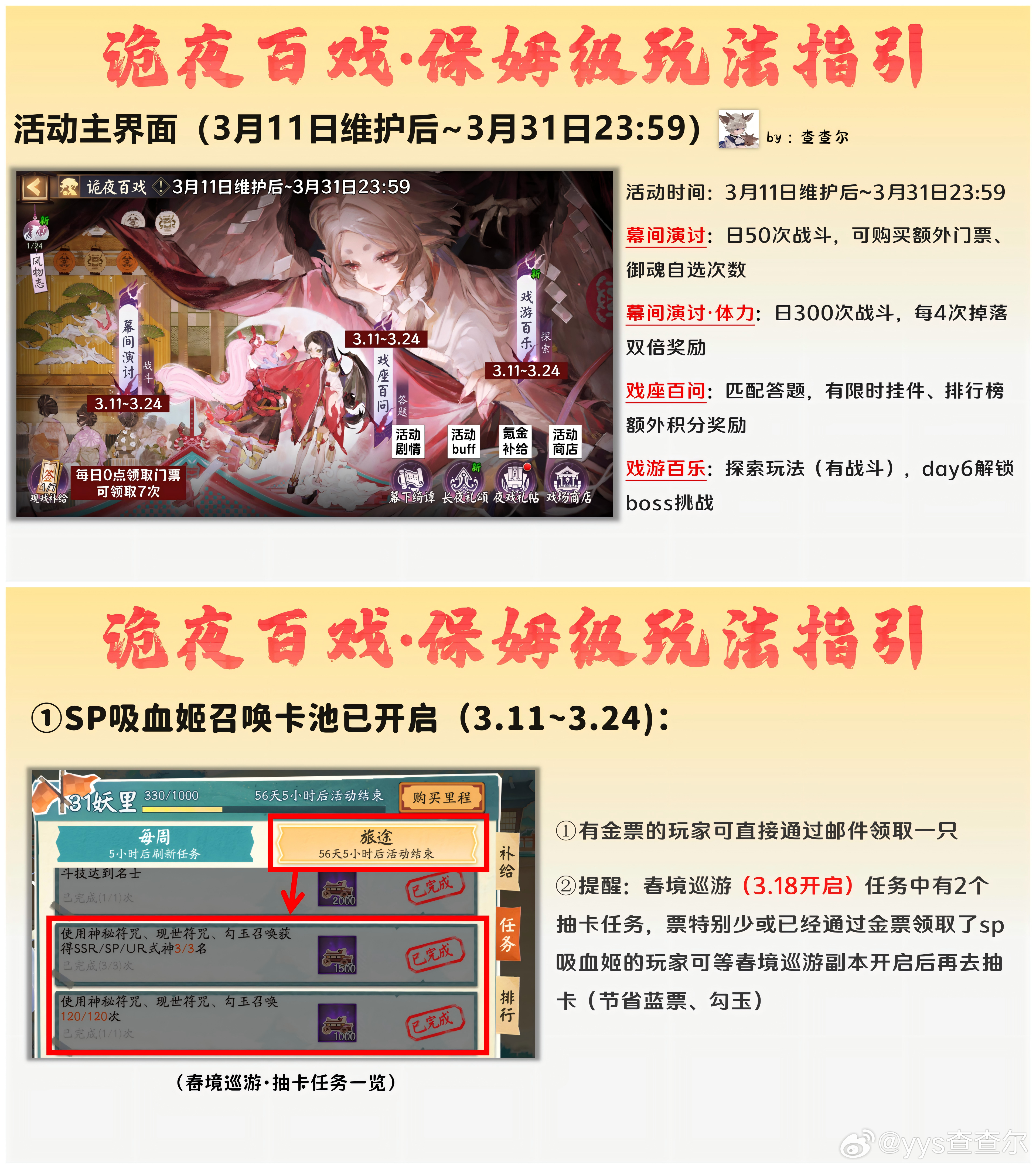 阴阳师手游超话创作官acg优创官 【诡夜百戏】sp吸血姬活动,一套图文搞定全部玩法+阵容配置,轻松无脑抄作业~ ■活动时间:3.11~3.24(2周) 图一~图四:全玩法介绍图五:爬塔阵容,2套推荐(最快4~5s)图六:探索阵容3套推荐(兔季阵容放爬塔里了)■探索玩法第六天会解锁小boss战,累计伤害可得头像框、积分等奖励。对应阵容后续更新(已测完,还没做好)