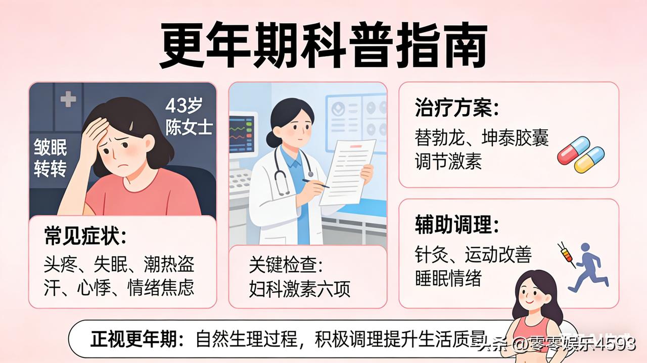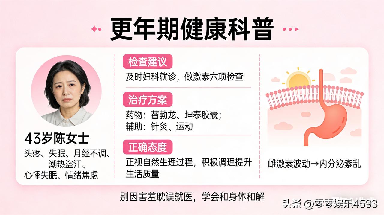 朋友你有这样的经历吗?43岁的陈女士最近总被头疼、失眠困扰,跑了好几家医院检查都没查出问题,直到闺蜜提醒 “是不是更年期到了?”,一检查才发现雌激素波动导致内分泌紊乱。其实更年期症状远不止月经不调,潮热盗汗、心悸失眠、情绪焦虑等都可能找上门,别以为是 “小毛病” 就放任不管。 建议女性出现不明原因的身体不适,及时去妇科做激素六项检查,对症调理很重要。医生会根据情况选用替勃龙、坤泰胶囊等调节激素,搭配针灸、运动改善睡眠和情绪。更关键的是要正视更年期,它是自然的生理过程,积极调理能有效提升生活质量。别因害羞耽误就医,学会和身体和解,才能平稳度过这段特殊时期。