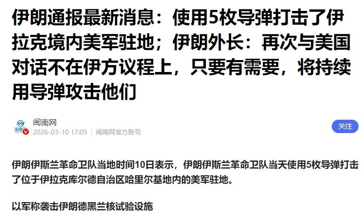 伊朗取得重大战果!3月10日,伊朗革命卫队发布消息称,已使用5枚导弹袭击美军哈里尔空军基地,现场升起浓烟,这也是交战10天里,第三次对该基地进行导弹袭击,在这次袭击中,伊朗直接摧毁了该基地一处重要雷达。   过去几年,这里就没消停过,2023-2024年间多次被伊拉克亲伊朗武装用无人机和火箭弹骚扰,基本成了“消耗战”的靶子。   但这次不一样,自从2月28日美以大规模空袭伊朗本土开始,革命卫队把报复范围直接扩展到代理人+本土导弹结合的模式,哈里尔基地从“代理人低烈度骚扰”升级成了革命卫队正面导弹打击的对象。   到2026年,伊朗导弹的圆概率误差据预测已压缩到极低水平,能实现“手术刀式”打击。   这次5枚导弹就能锁定雷达这样的高价值目标,恰恰印证了他们过去两年在固体燃料、数字化制导和饱和攻击上的积累。   美军C-RAM和爱国者系统面对廉价无人机群时成本就很高,现在再叠加高精度弹道导弹,防御压力指数级上升。   伊朗发言人甚至公开说,摧毁多部先进雷达后,美军在中东的“眼睛”已经被致盲,战场主动权正在转向。   这场冲突已经打了十多天,美以一开始靠空中优势狂轰伊朗本土,声称摧毁了大量导弹库存和生产设施。   但伊朗的反击节奏完全没乱,通过“真实承诺4”多轮行动,把打击面铺开到伊拉克、叙利亚、海湾多国美军基地,甚至波斯湾油轮和海峡通道。   哈里尔基地这次被点名,标志着伊朗把战火烧到了美军在伊拉克的深层神经中枢。   美军如果继续增兵或升级空袭,伊朗很可能进一步扩大饱和攻击规模,用更多无人机+导弹组合把美军防空系统拖垮。   伊朗通过本土导弹直接打美军基地,等于在告诉华盛顿:你们可以从本土起飞B-2轰炸我,我也可以从本土发射导弹打你的前沿部署。   美军现在面临两难:死守基地继续挨打,会不断消耗资源和士气;大规模撤离,又等于战略收缩,丢掉在中东的影响力。   伊朗这边虽然本土挨了重创,但导弹库存和生产链的韧性超出很多人预期,他们赌的就是持久消耗,把美以拖进泥潭。   伊朗用行动证明,他们有能力让美军在中东的每一处基地都睡不安稳;美以则想通过持续空袭把伊朗导弹工业连根拔起。   哈里尔基地雷达被毁只是冰山一角,接下来谁能真正掌握制信息权和消耗耐力,才决定这场冲突的走向。 信息来源:闽南网