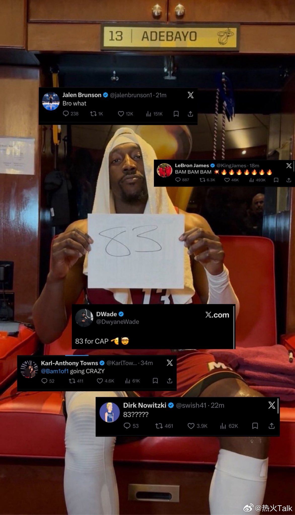 詹姆斯、韦德、诺维茨基、皮尔斯、文斯卡特、唐斯、米切尔、杰伦布伦森等球星都在祝贺阿德巴约的83分,有些人却在破防,开心就完事了兄弟们阿德巴约83分阿德巴约现役得分王
