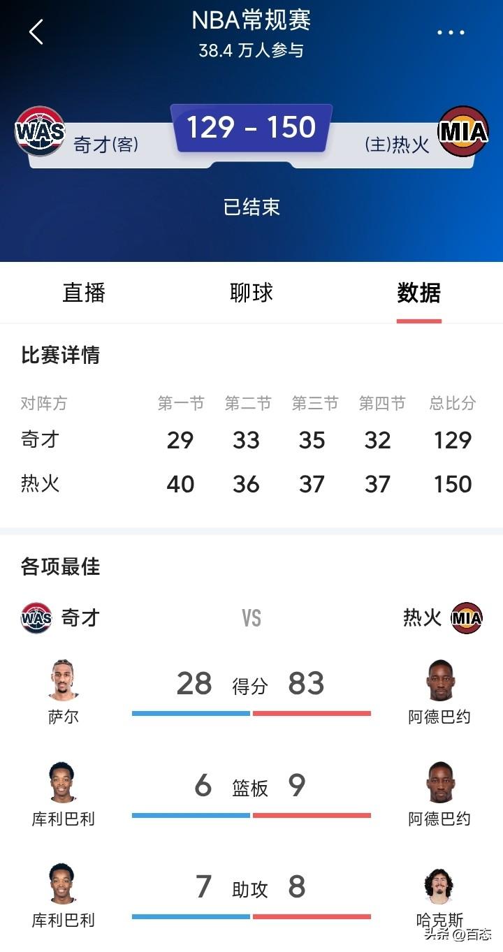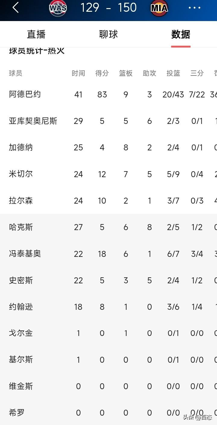 热火主场对阵奇才,阿德巴约创造的纪录。得分纪录 ,83分超越科比81分,列历史第二。罚球纪录 ,43次罚球出手,超霍华德39次,36次罚中超张伯伦28次,均为历史第一。队史纪录 ,单场83分超詹姆斯61分,单节31分超詹姆斯25分16。单节得分 ,首节31分列历史第二,仅次于乐福34分。 看到这不敢想象一个人得分83分,有的队总得分可能都没有83分,有人说这纪录很容易破,只是你想不想刷而已,确实是这么回事。只要足够的出手次数,得分肯定会高。 赢球才是关键,只要赢球就是全部都他投,我相信也没人说什么,能打破纪录,另一方面来说,阿德巴约确实是厉害。 对此你们怎么看呢?你们觉得这纪录难吗?