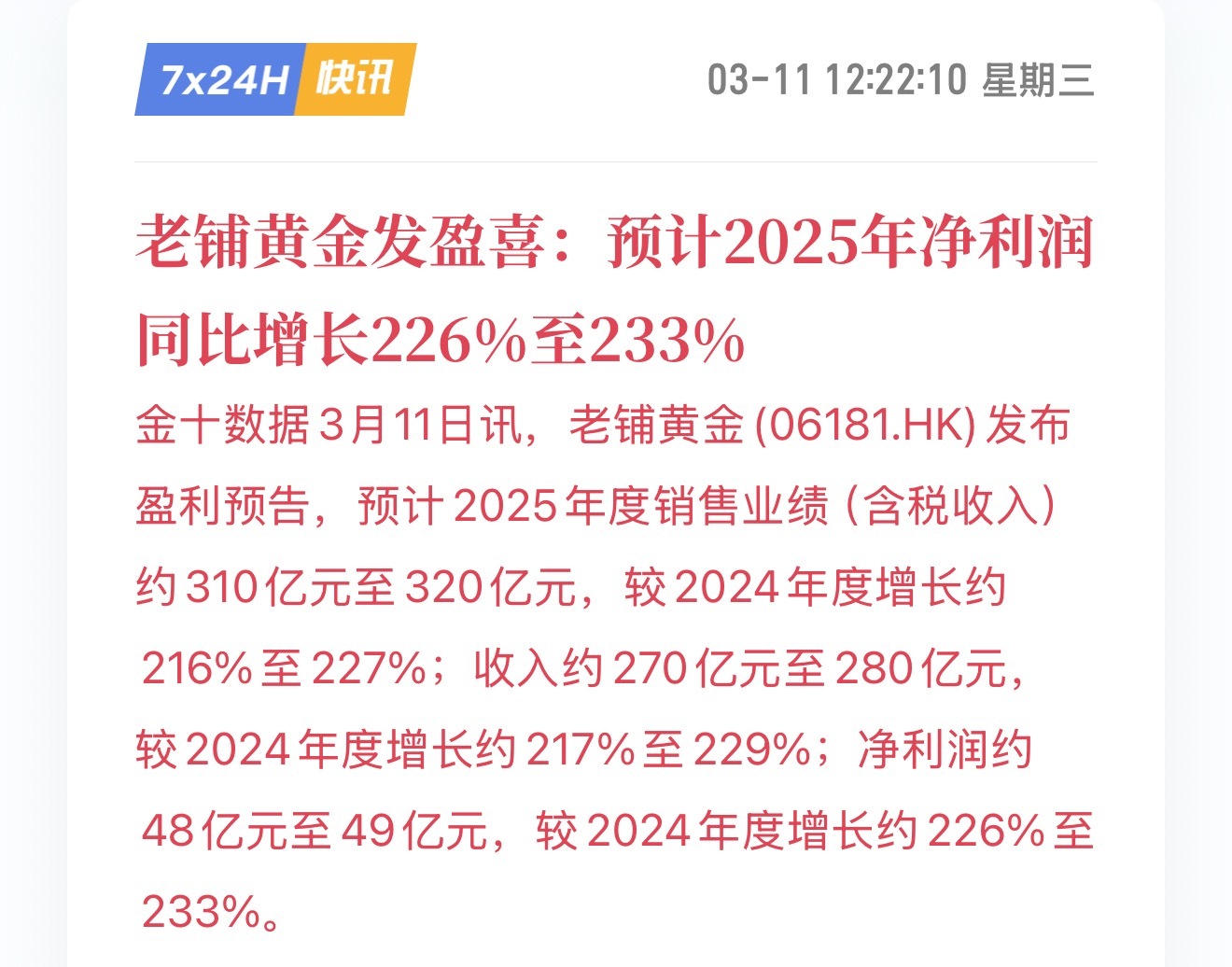 老铺黄金发盈喜:预计2025年净利润同比增长226%至233%【我刚刚又买了个20万的老铺黄金】黄金金价老铺黄金