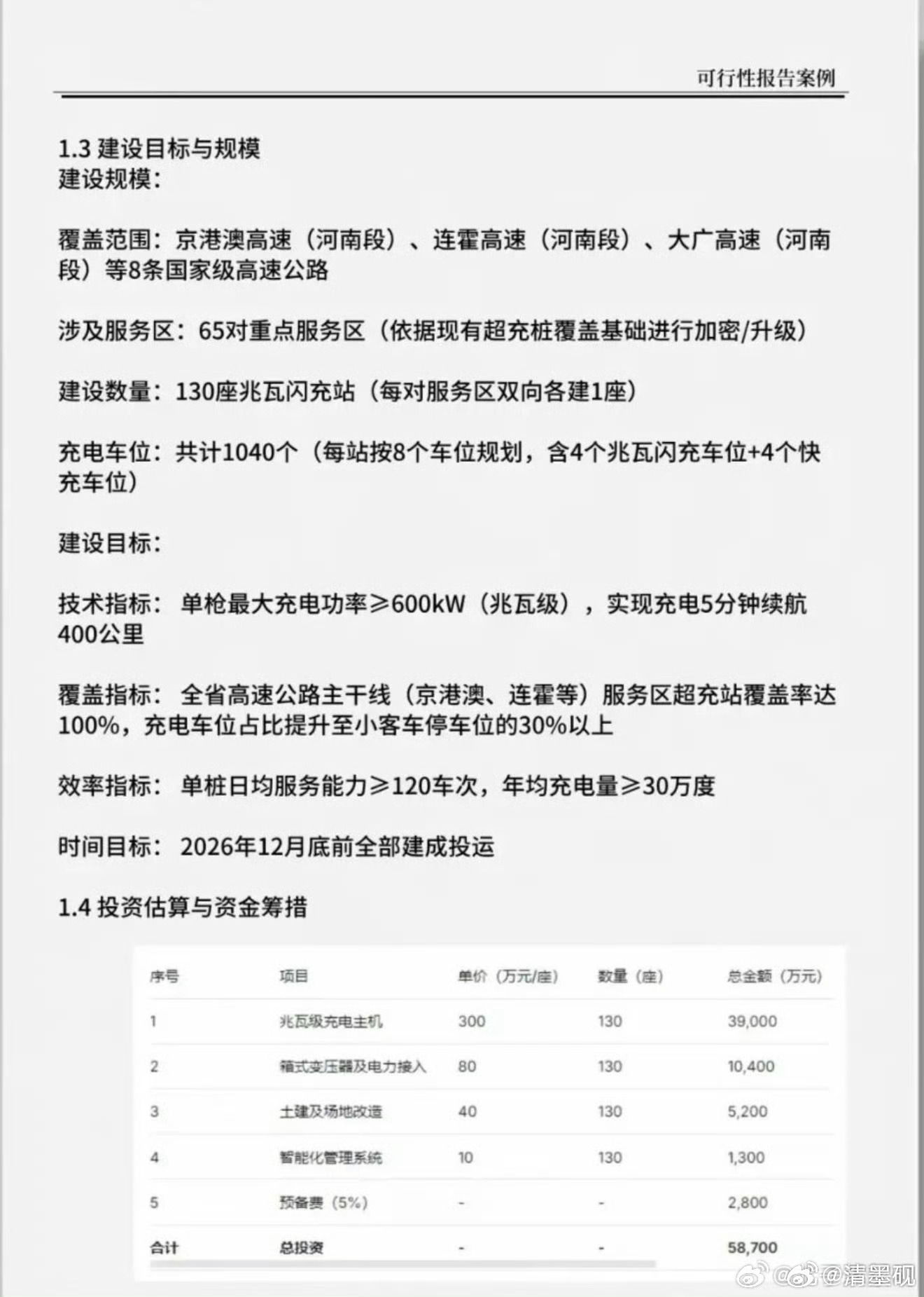 作为多年公路工程行业的从业者!我还是能从这个工可中看到一些东西的!1、工可是干嘛的,这是项目立项的前提,他论证了工程的可行性,必要性!这个项目满足了国家战略需要,满足了服务区运营需要,降低停车场充电桩的建设需求,还有超高的内部收益率,我们公司6.5的内部收益率都投!这种测算跟捡钱一样,不要质疑这份报告的不专业,这可是要专家评审,上党委会集体决策的,这种报告的批复应该在省交通厅,代表着政府行为!2、这份报告给了闪充明确的价格,高速建站,一把枪50万!一般是不让突破这个价格的,当然这个价格是估算,后面还有具体项目的概算,预算!这种项目的自有资金占比60%(企业40,政府补助20)贷款40%!如果是其他公路基建项目,自有资金25%就能贷款了,毕竟公路使用寿命长,充电桩是按照5年的使用寿命测算的!这个我认为是合理的,科技进步日新月异!相比于换电,我认为性价比很高,从折旧时间,内部收益率,资源消耗率,环境适用性等,各方承担的成本很低,是一个优秀的解决方案!这个标花落谁家?图片来源比亚迪比亚迪闪充
