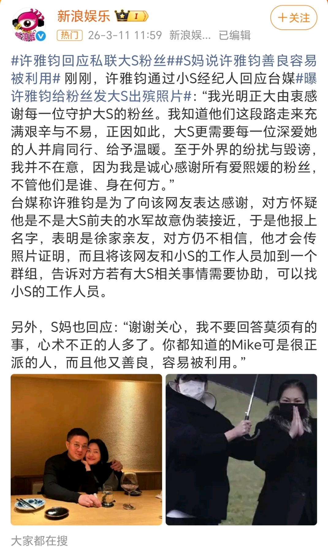 许雅钧回应新闻报导:「我光明正大由衷感谢每一位守护大S的粉丝。我知道他们这段路走