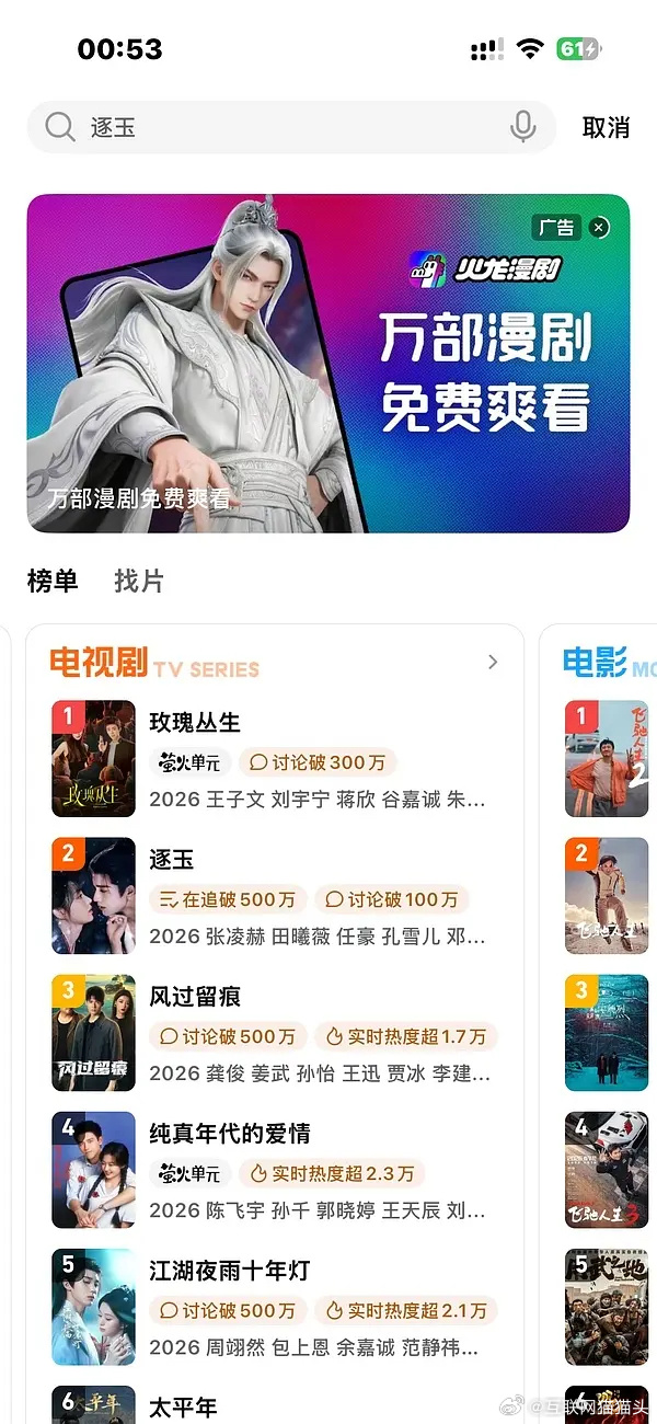 逐玉🐧站内热搜榜被刘宇宁新剧压了