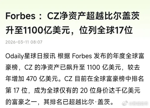 CZ超越比尔盖茨升至1100亿美元,位列全球17位,CZ赵长鹏表示不认可