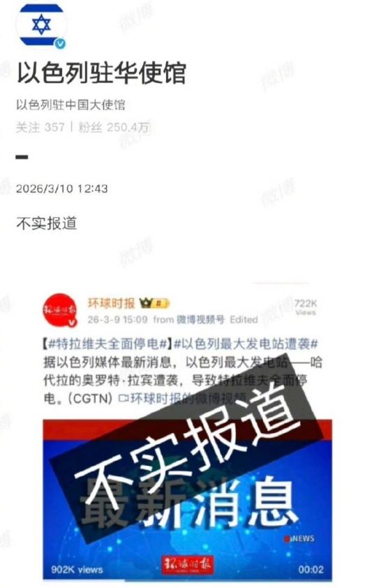 以最大电厂被炸,首都停电,中国官媒报道后,以驻华使馆破防:都是谣言! 日前《环球时报》报道称,伊朗对以色列关键发电厂发动打击,造成特拉维夫停电。然而这个消息却让以色列驻华大使馆当场破防,称这条消息为“谣言”。 要是真的是谣言,以色列犯不着这么大动干戈,毕竟中东那边冲突不断,各类传言本来就多,没必要单单对着中国官媒的报道跳脚。 不仅以色列驻华使馆急着否认,以色列本国的媒体对此更是缄口不言,连一句相关的报道都没有, 这种反常的沉默,反而比急着否认更能说明问题。 真相其实很直白,以色列之所以这么拼命掩盖,甚至不惜跟中国官媒“掰扯”,核心就是怕丢人,更怕国内民众恐慌,而他们用来堵住悠悠众口的手段,狠到让人咋舌。 紧急立法,谁要是敢在社交媒体上发伊朗导弹击中特拉维夫的消息,不管是文字、照片还是视频,最高能判5年监禁。这哪里是管控信息,分明就是搞“数字戒严”,逼着所有人都装聋作哑。 据说,被击中的可不是什么小电厂,而是以色列最大的奥罗特·拉宾发电站,就在哈代拉市,这座电厂承担着以色列全国19%的电力供应,相当于整个国家电力系统的“心脏”。 当地时间3月9号夜里,伊朗的导弹精准命中了这座电厂,核心机组直接被损毁,紧接着特拉维夫就全面停电,繁华的都市一夜之间陷入漆黑,只有防空导弹拦截时的火光偶尔闪烁,医院被迫启动备用发电机,电梯困人、手机断电,老百姓的正常生活彻底乱了套。 以色列不是有号称“天下第一”的铁穹防空系统吗?怎么连自己的核心电厂都护不住?其实伊朗早就摸透了铁穹的弱点,先用低成本的无人机和老旧导弹消耗以军的防空弹药,等对方库存告急,再用高超音速导弹精准打击,最后10秒还能突然加速变轨,铁穹根本来不及拦截。说白了,以色列的防空神话,这次算是被彻底戳破了。 以色列之所以急着否认,说到底就是输不起。被伊朗直接击中核心民生设施,意味着他们的防御体系形同虚设,传出去会丢尽脸面,也会动摇国内民众的信心; 他们国土狭小,没有战略纵深,全国就靠几座电厂支撑电力,一旦电厂被炸,淡水供应、交通、通信都会跟着瘫痪,这种狼狈样,他们怎么敢让全世界看到? 不管他们怎么掩盖,电厂被炸、首都停电的影响是实打实的,紧急立法的操作更是此地无银三百两。 与其否认、堵住嘴巴,不如好好反思一下,为什么会被伊朗打到家门口,为什么好好的和平不去争取,非要抱着霸权思维四处挑事。毕竟,纸终究包不住火,越是遮掩,越能说明心里有鬼。