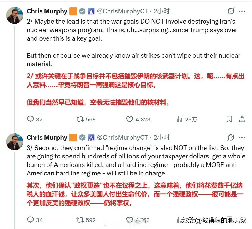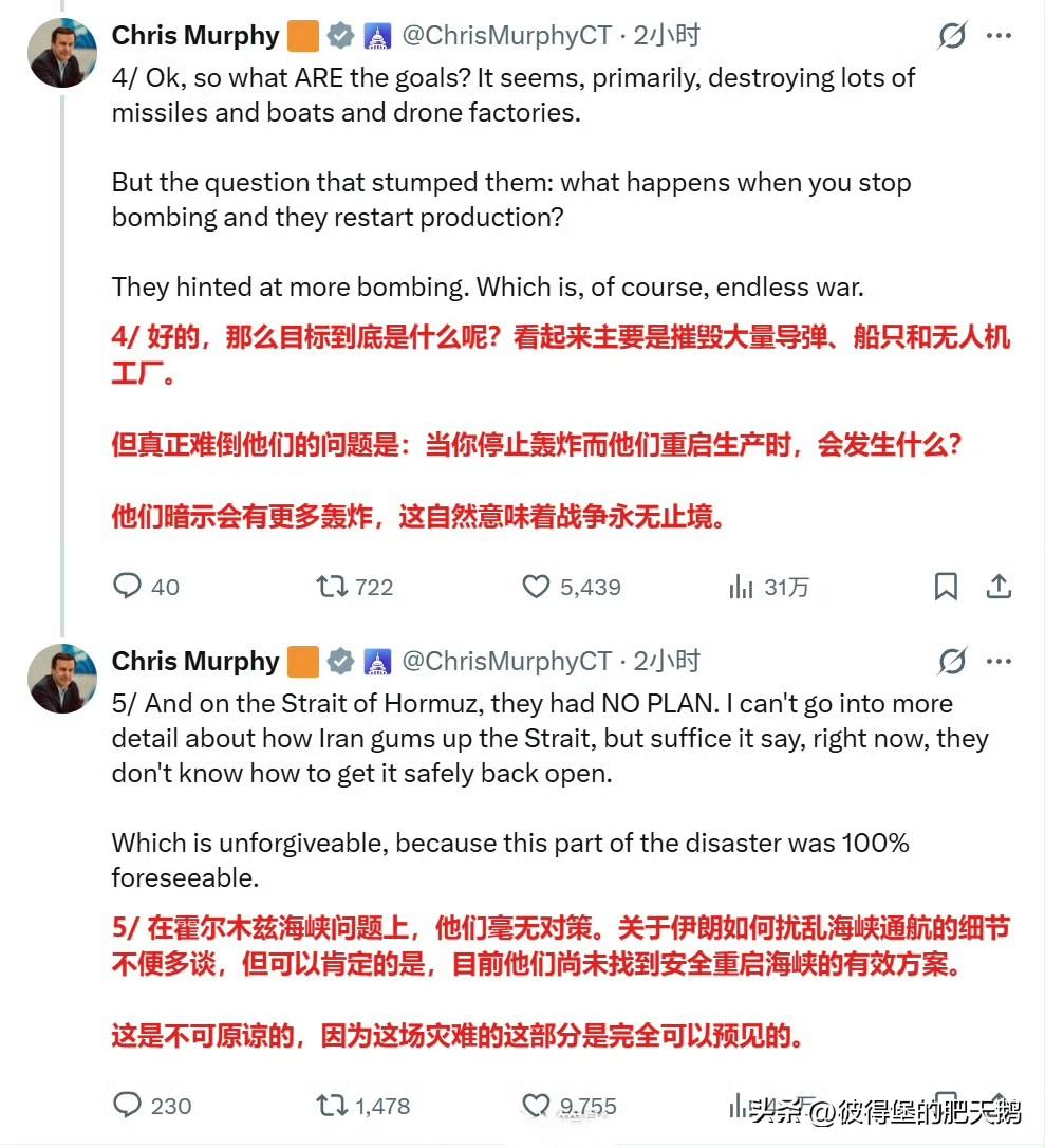 美国参议员克里斯·墨菲也在社交媒体分享了他今天参加伊朗战局简报会的内容。 这是我今天看到的第三个吐槽简报会的参议员了,他们分享的内容也大同小异,基本都是: 1、作战计划有多么混乱和不完整。 2、空袭无法摧毁伊朗的核材料,但战争的目的本来也不是这个。 3、现在美方在确认“伊朗政权更迭不在议程上”的情况下,主要目标是摧毁伊朗的反击力量,比如导弹和无人机之类,而且后续会疯狂轰炸,但他们自己也说不清,如果不炸了,伊朗又恢复生产怎么办。 4、针对霍尔木兹海峡的问题,美国方便至今没找到合适的应对方案,甚至很明显的是,美国在打伊朗之前甚至都没做过这方面的预案。 #海外新鲜事##伊朗局势最新情况#