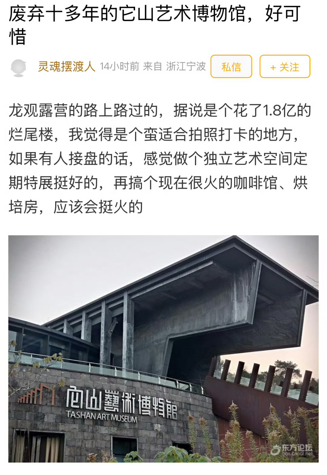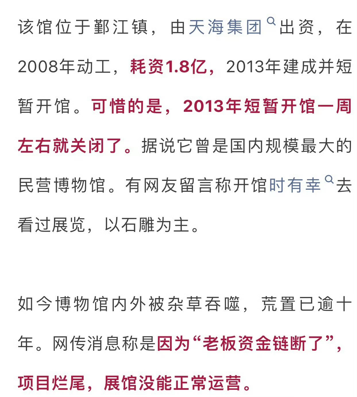 宁波这座博物馆投资1亿8如今杂草丛生 投资1.8亿,宁波这座博物馆杂草丛生,沦为“烂尾楼”!网友感叹:当年边上业主遭殃!该馆位于鄞江镇,由天海集团出资,在2008年动工,耗资1.8亿,2013年建成并短暂开馆。可惜的是,2013年短暂开馆一周左右就关闭了。据说它曾是国内规模最大的民营博物馆。有网友留言称开馆时有幸去看过展览,以石雕为主。如今博物馆内外被杂草吞噬,荒置已逾十年。网传消息称是因为“老板资金链断了”,项目烂尾,展馆没能正常运营。
