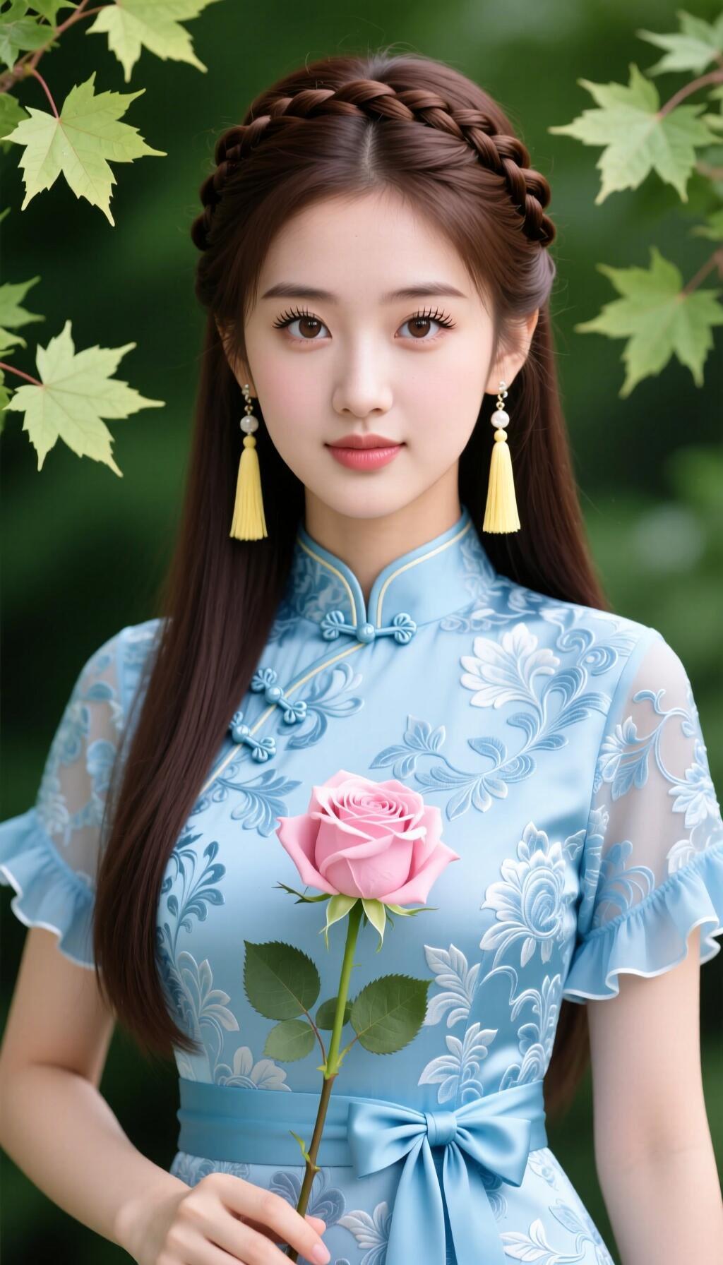 优雅古风少女,手持粉色玫瑰,置身自然绿意中。