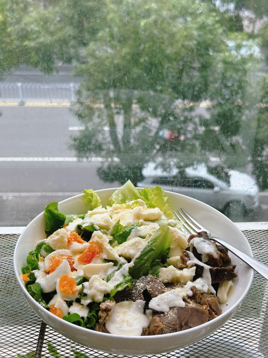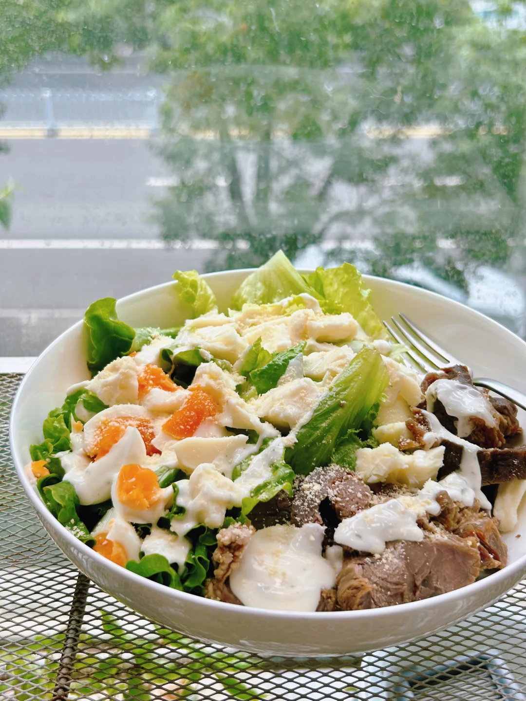 早餐 早午餐 生菜打底,🥚水煮蛋,🧀萨斯卡莫扎奶酪,都是一样的弹软口感,一起掰成小块铺在上面,加上自己卤的牛肉切片。 来来回回挤上欧萨皮塔酱(酸味儿,类似塔斯丁用那种) 最后撒一些帕玛森芝士碎。 这一大碗,能顶到下午了[害羞R]