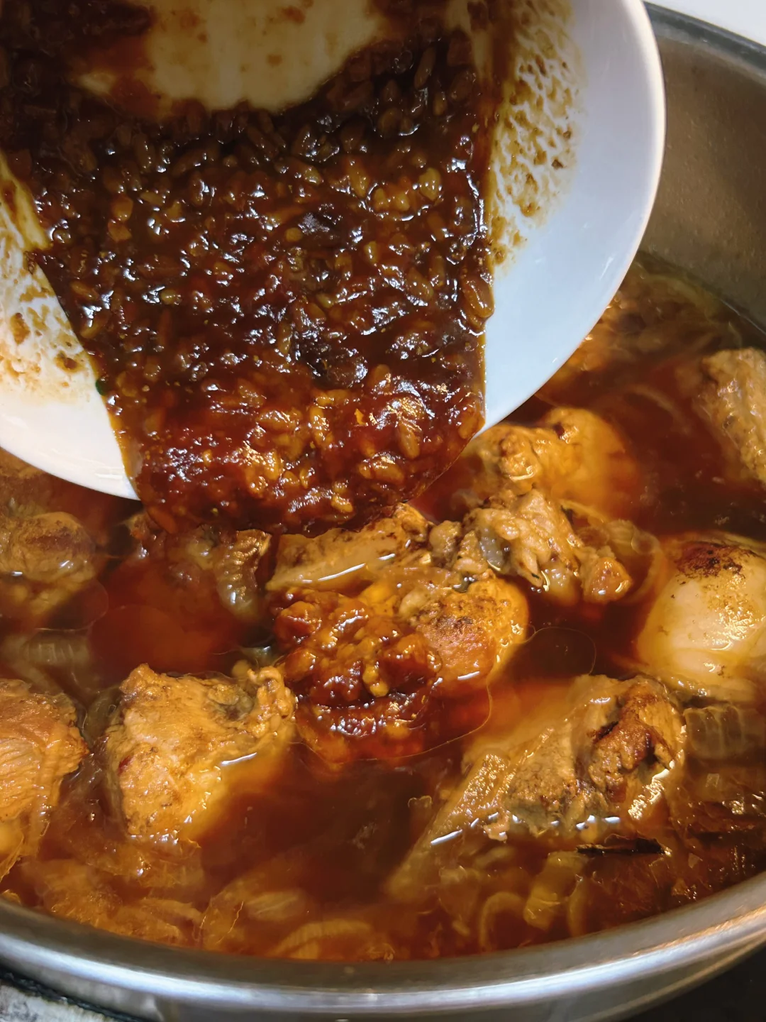 6️⃣ 裹:提前蒸好的酱料倒进去,8min收汁,每根排骨都穿酱外套!