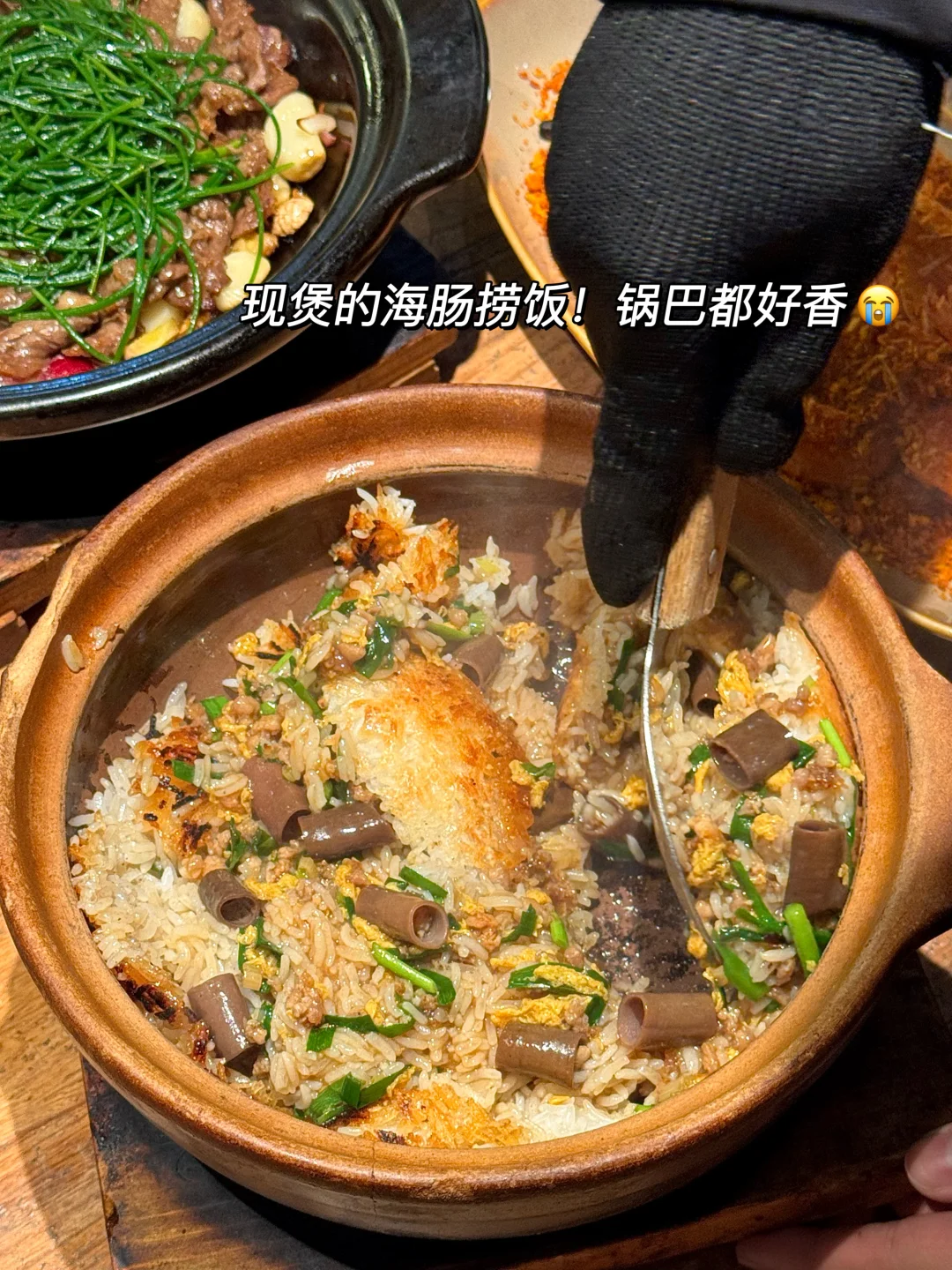 啊啊啊竟然在上海也吃到香喷喷的海肠捞饭了!就在长寿路 真的巨巨巨好吃!黏糊糊咸香又鲜甜!现煲出来带着锅巴,真的一口惊艳。。 店里很多来吃的都是广东人~口味地道正宗!咸蛋黄鸡翅太香了🤤外酥里嫩一吃一个不吱声。。沙葱牛肉鲜嫩大片 和朋友几个瞬间光盘……还有啫肥肠、瑶柱酿豆腐、凉虾糖水…没一道不好吃的!!! 缺点就是不开在我家楼下😭😭😭 叫:啫苑📍)